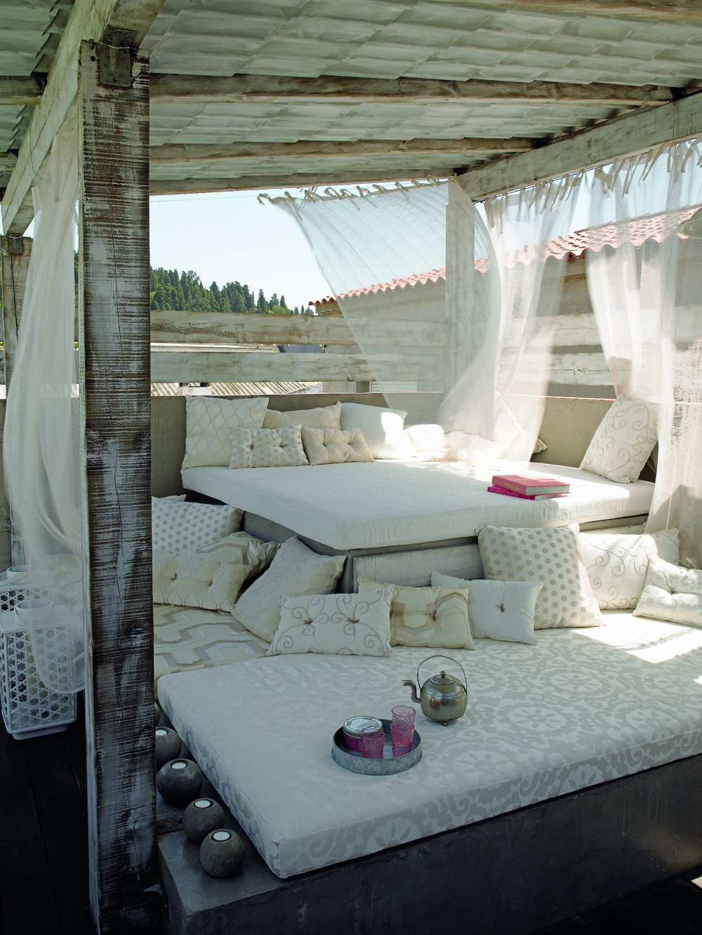 En el jardín el visillo también es el protagonista, nos da ese toque de fiesta en la terraza o en la glorieta, nos ofrece una sombra ligera bajo el sol del atardecer. Y sí… ¡ya llegaron las vacaciones! Solo nos queda disfrutar que solo son una vez al año.