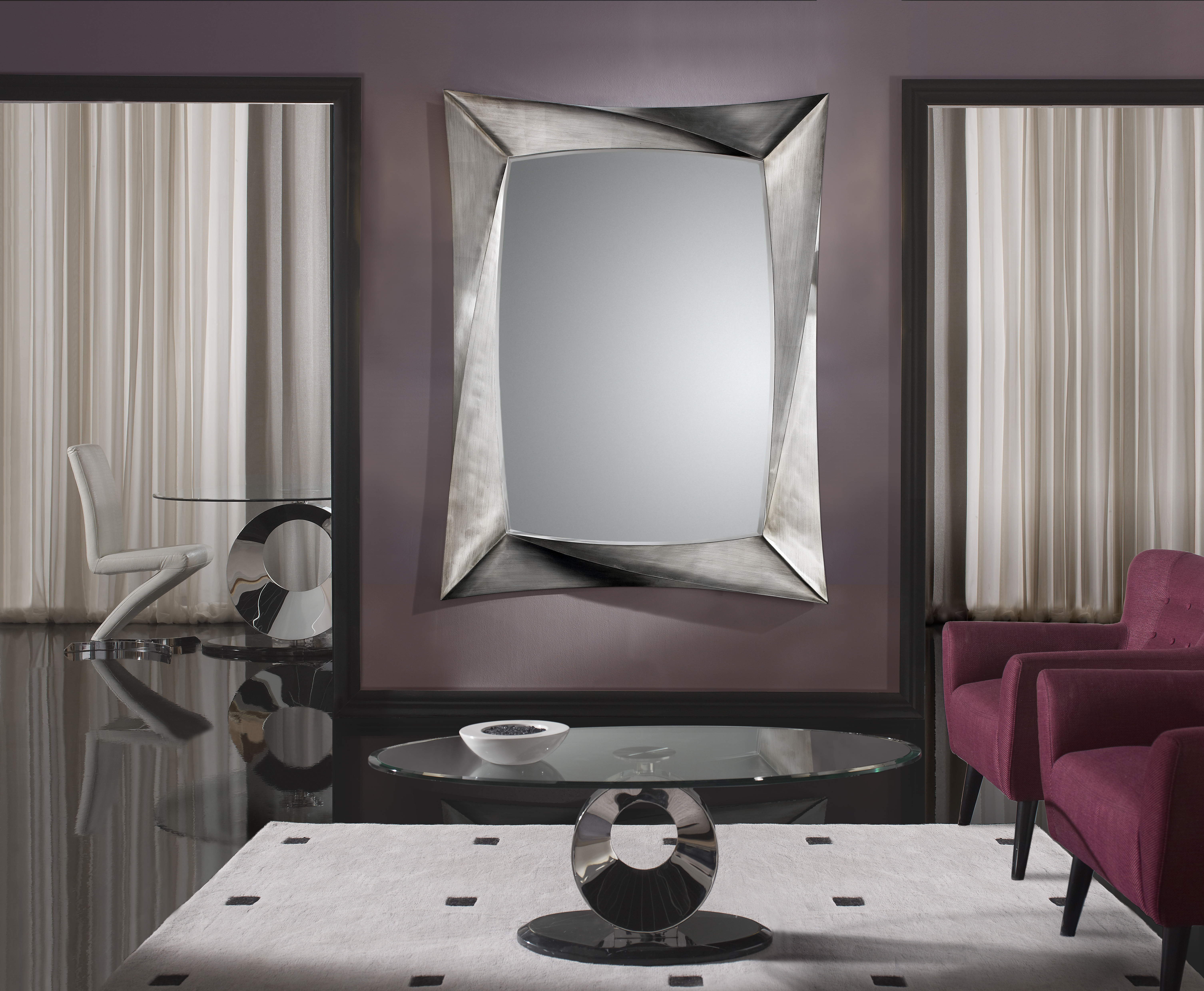 Espejos modernos, son espejos atrevidos que sorprenden por sus diseños y formas redondeadas, rectangulares, rombos, cuadradas, con marcos anchos y moldeados formando ondas, aros y calados, acabados en pan de plata patinada o envejecida. También hay marcos de poliuretano moldeados y decorados con mosaico de espejos quebrados y detalles en pan de plata.