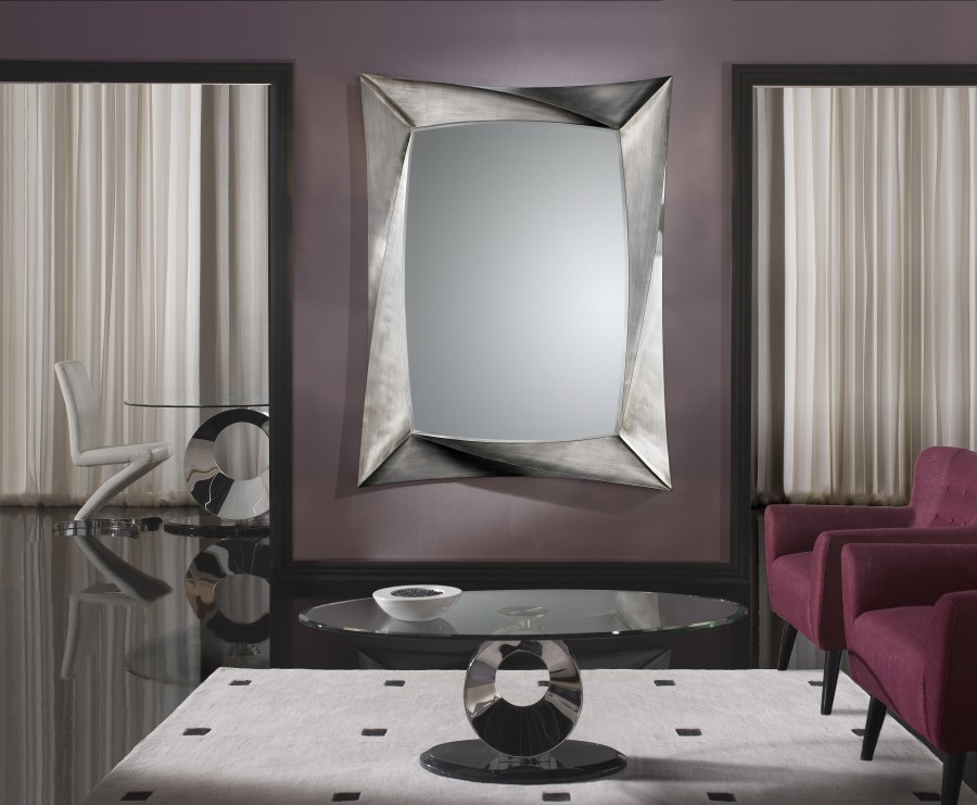 Espejos modernos de cristal, son espejos compuestos por pequeños espejos biselados, de formas irregulares y colocados en diferentes planos, haciendo formas muy originales y sin marco, lo cual es una ventaja a la hora de combinarlo con los colores de las paredes. Son muy decorativos, por sí solos decoran la pared, y son de los más utilizados.