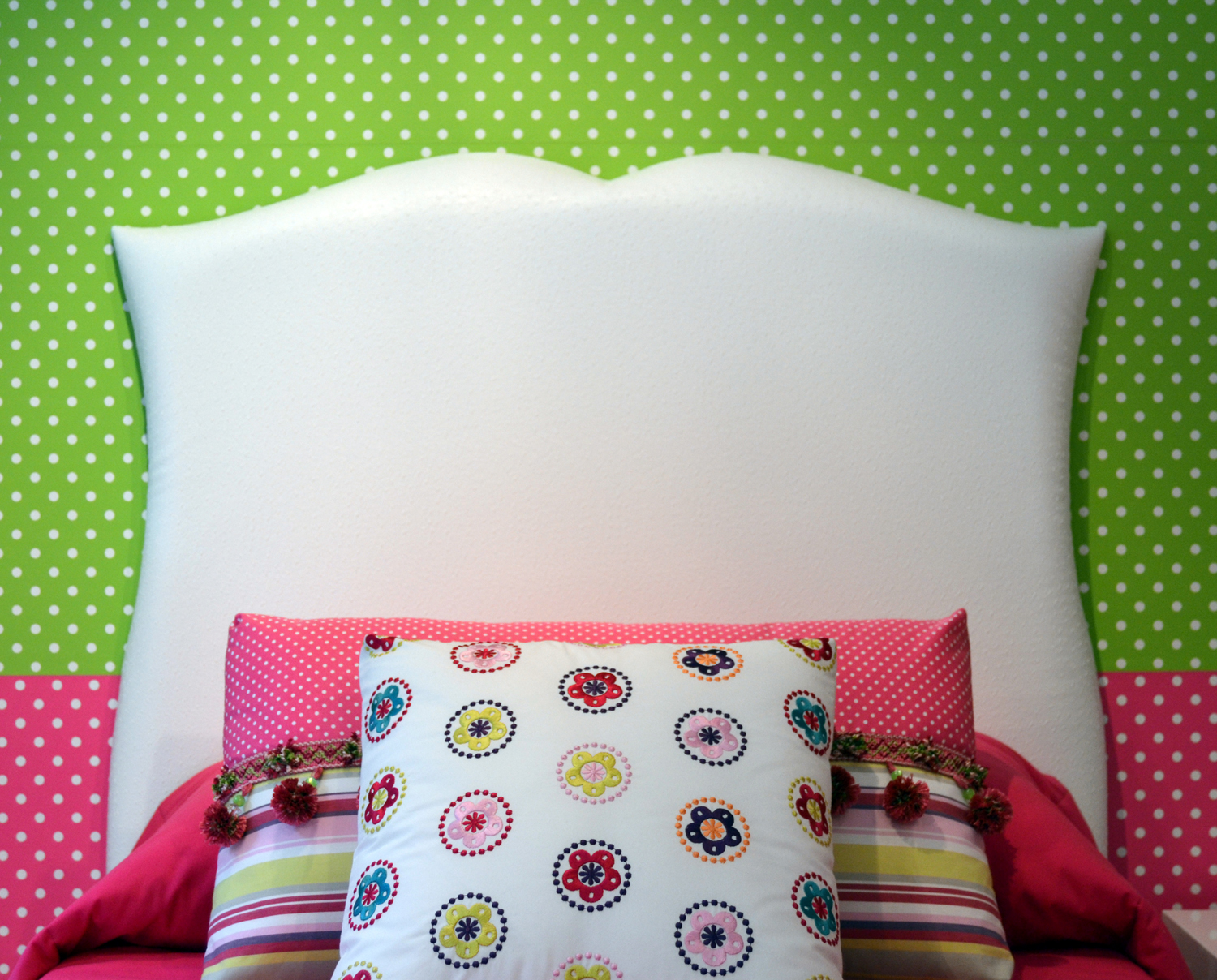Los colores que predominan en este ambiente son el fucsia que es un color lleno de energía y vitalidad, y el verde que está unido a la naturaleza, a la frescura,… Estos dos colores son llamativos pero combinan a la perfección, junto a la divertida colcha, cojines y a la vistosa cortina, hacen de este ambiente ideal para la habitación de tu princesa.