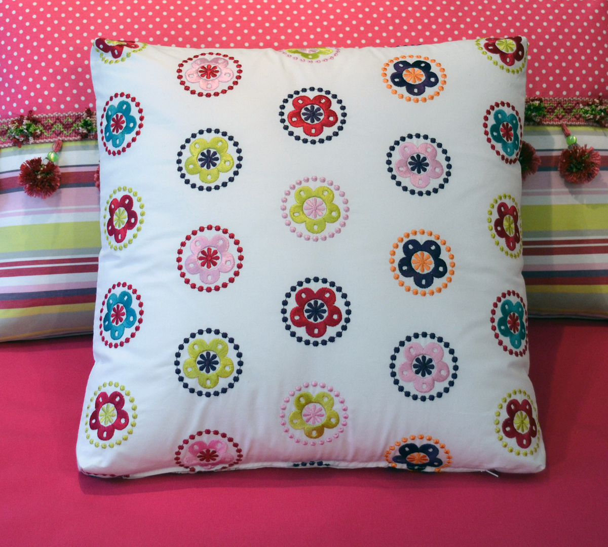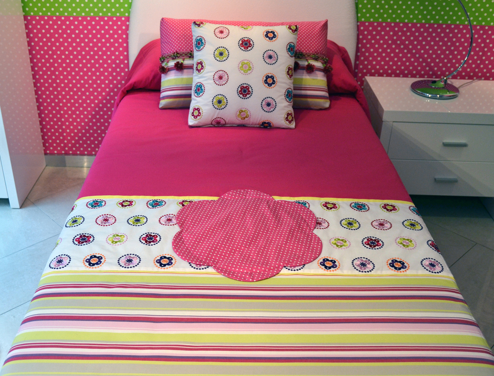 La colcha acolchada es una original combinación de tres telas distintas, la parte de arriba es lisa de color fucsia, en el centro una preciosa tela con fondo blanco y unas flores bordadas de muchos colores y abajo una tela de rayas. El detalle especial, es la aplicación de la flor en el centro de la colcha con una tela fucsia con un discreto estampado de lunares pequeños.