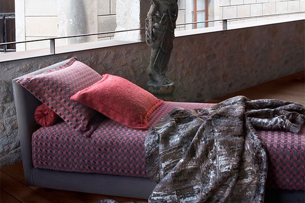 El agradable jacquard con motivo abstracto es la base de este rincón acogedor, con varios cojines de distintos diseños, combinados con lisos, con hilos de fantasía y con un color rojizo, que le da color al ambiente.
