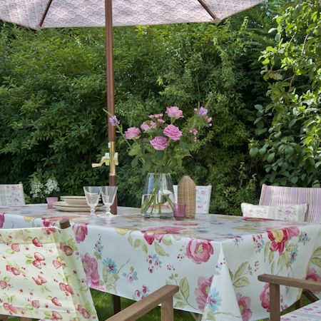 Ni que decir tiene que en el exterior la alegría son las flores, en este caso en el mantel de la mesa de esta terraza.