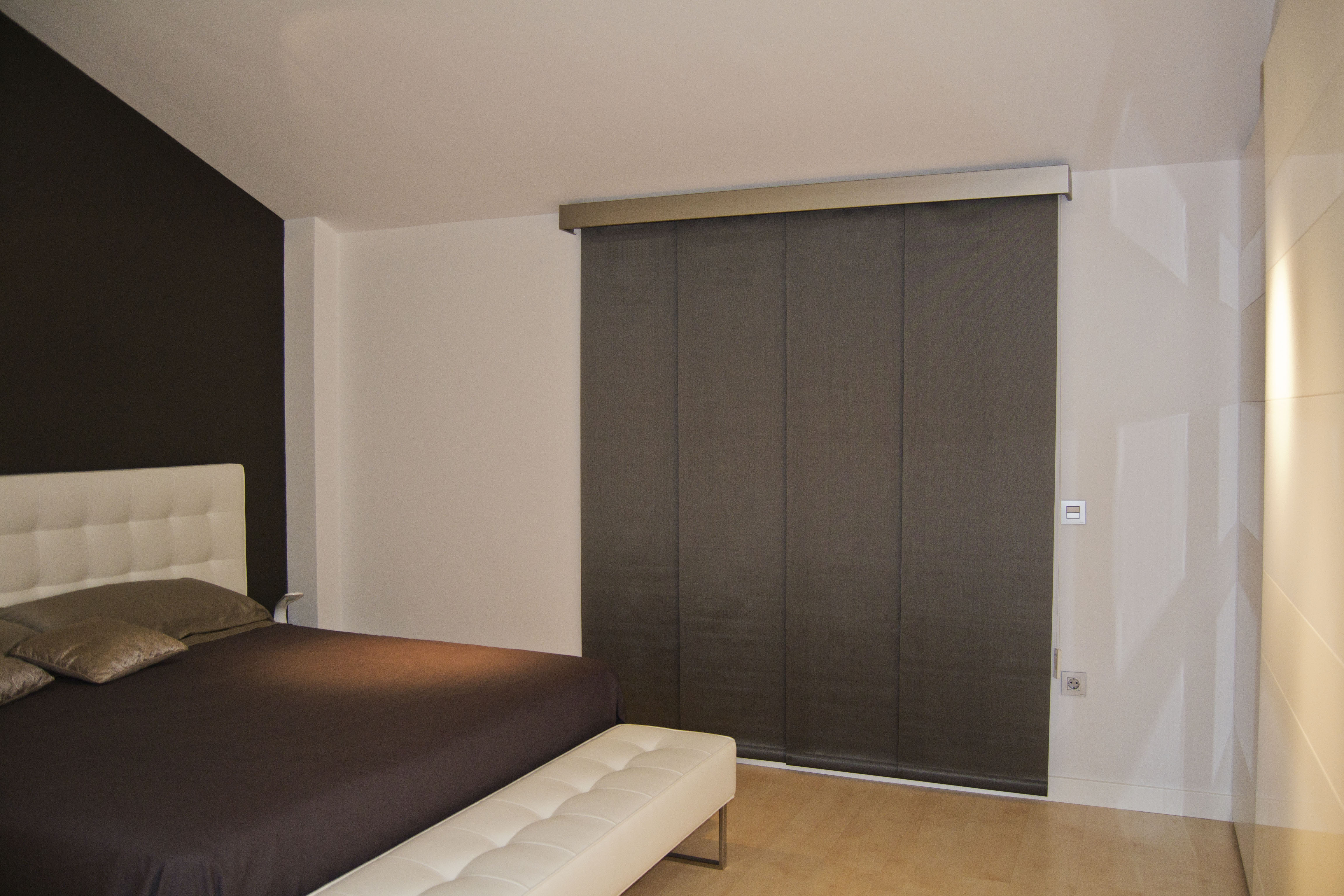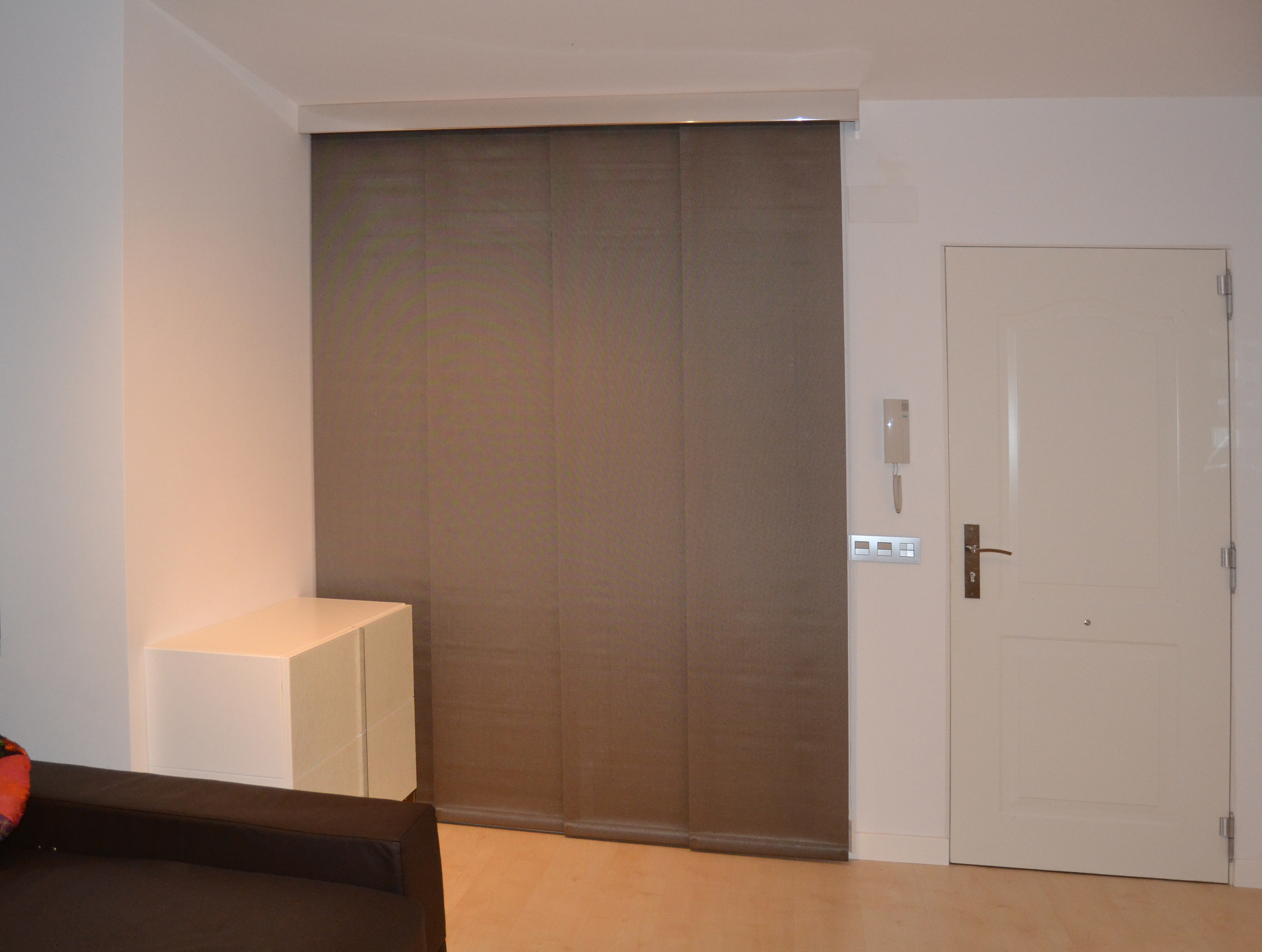 En la puerta era imprescindible que lo que pusiéramos llegara hasta el suelo, la enrollable no es muy práctica para una zona de paso como era el caso, porque tiene que estar siempre arriba para poder pasar cómodamente y se pasa más tiempo arriba, con la desventaja que no tienes intimidad. En cambio, el panel japonés tiene la ventaja que solo tienes que abrir el lado necesario para poder pasar, así el resto de paneles cubren perfectamente la puerta. Si quieres saber más del panel japonés en el post “El panel japonés una alternativa a la cortina tradicional” te cuento un poquito más de este sistema para vestir las ventanas.