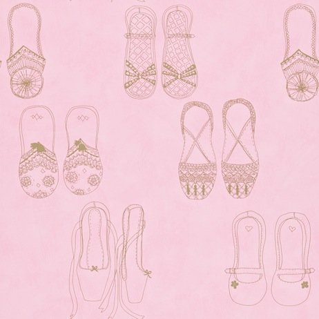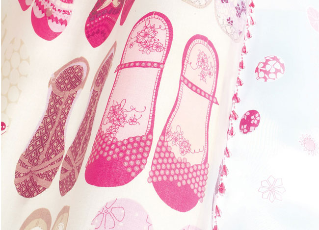 El papel pintado con zapatillas a juego con las telas, está en varios tonos. Otras combinaciones de telas con papeles las encontrarás en el post “2 Ambientes para niñas coordinando telas con papeles”.