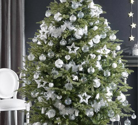 Este árbol me parece muy elegante, con bolas de cristal, copos de nieve, estrellas, e incluso animales que viven en zonas nevadas, todos en blanco, te trasladan a una Navidad glaciar.