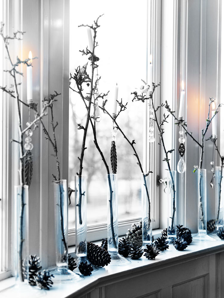 Con unas piñas, unas ramitas y unas lágrimas de cristal puedes arreglar un rincón del salón con mucha gracia, que llamará la atención de tus invitados.