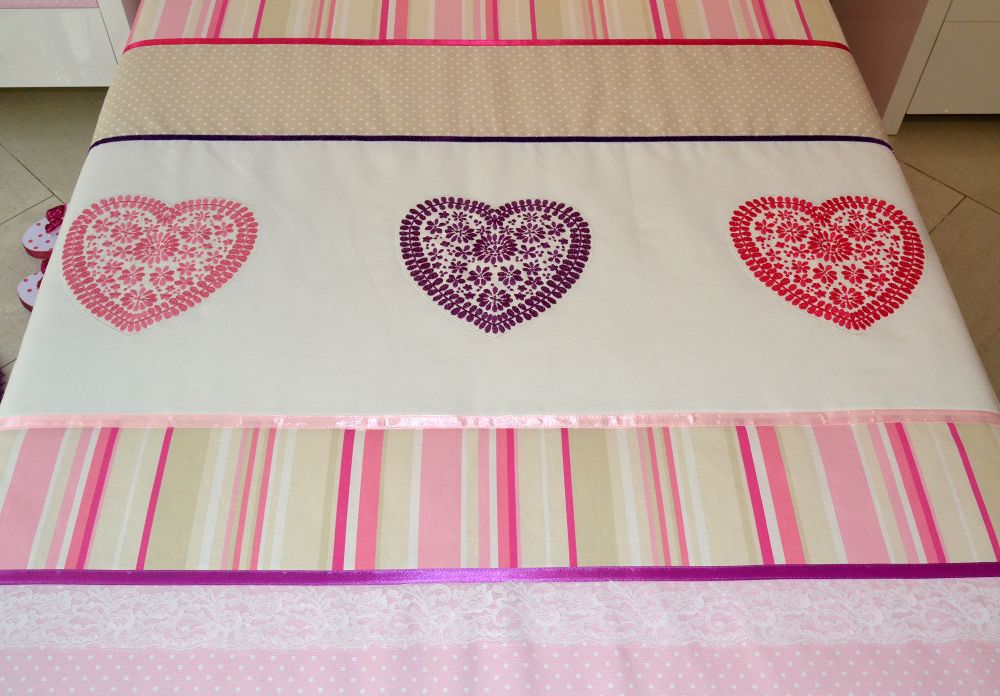 El cabezal en forma de corazón es muy bonito, pero con el detalle de la guirnalda de corazones bordados queda muy coqueto y decorativo, ¡¡está de moda!!
