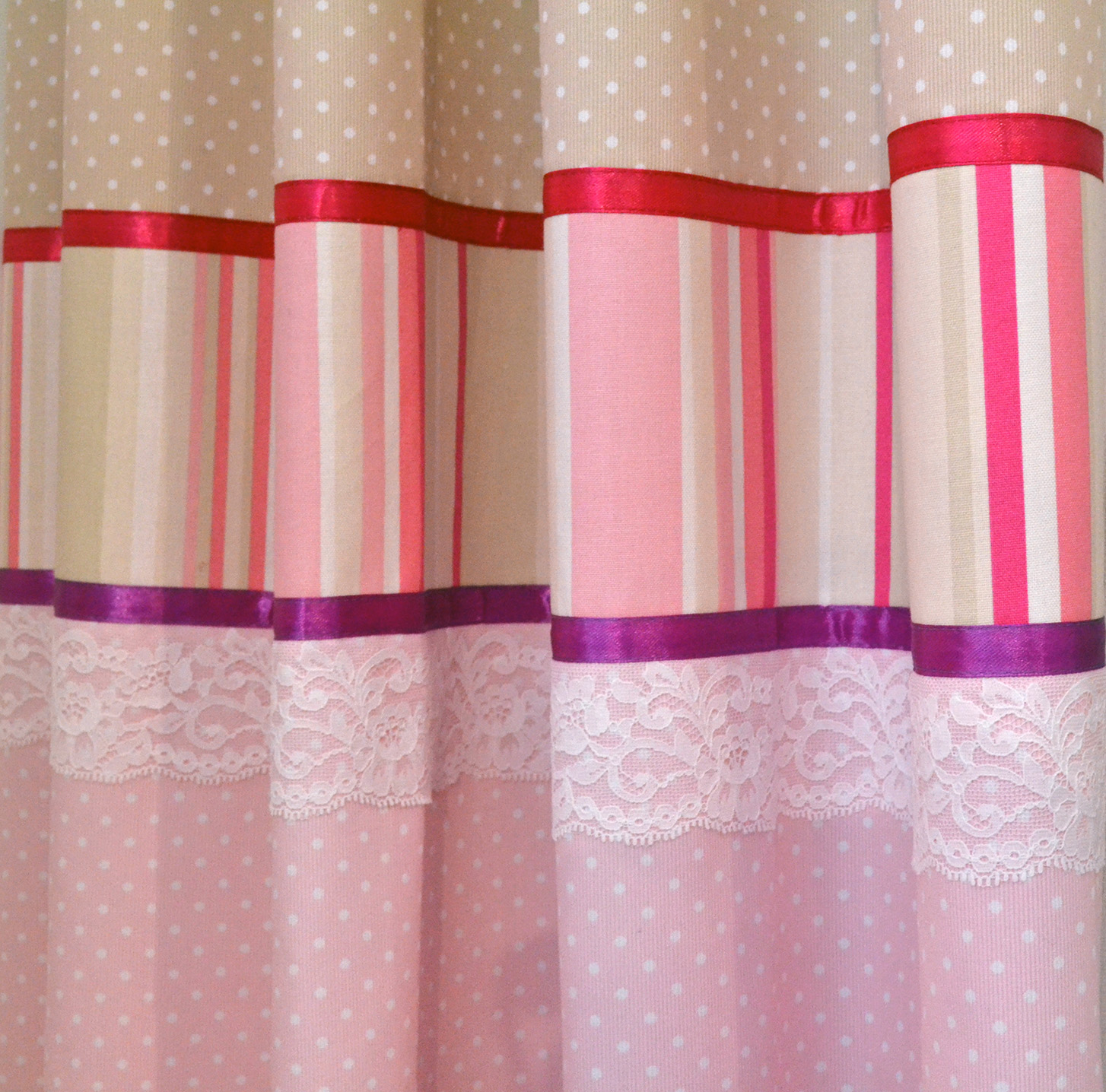 Las cortinas constan de un visillo blanco bordado con bodoques y una doble cortina también muy original, a juego con el resto de la habitación.