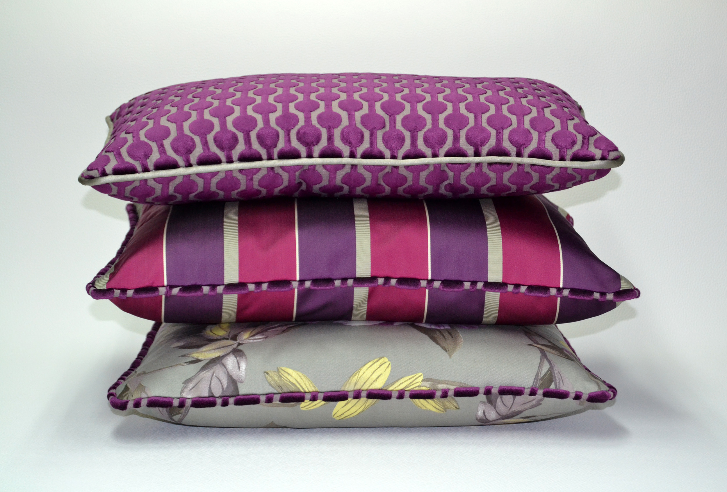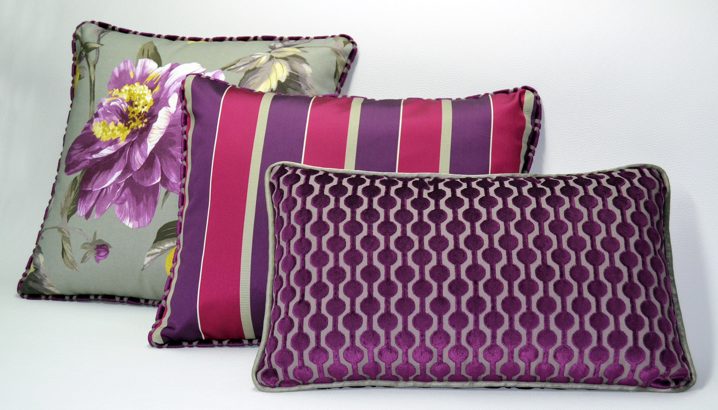 Es una colección de 3 cojines distintos en medidas, estampados y texturas, acabados con un cordón alrededor forrado de tela, que le da mucho encanto y distinción a los cojines.