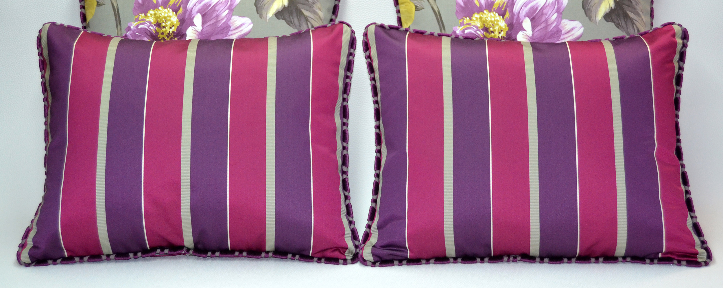 Estos cojines de rayas, son de 40 x 50 con unas coloridas rayas fucsia y orquídea radiante satinadas, muy alegres.