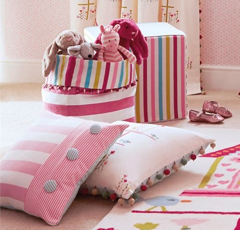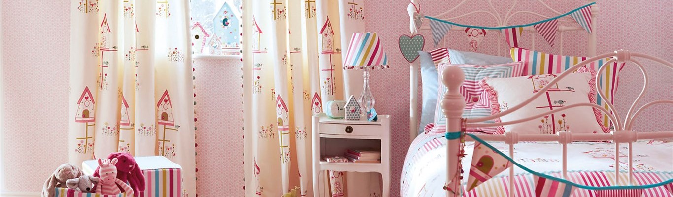 Las telas y el papel pintado son de Harlequin, es uno de los diseñadores que me gusta más para habitaciones de peques, y son los catálogos que suelo enseñar en la tienda, ¡son preciosos todos! También son los que nos inspiran para hacer los escaparates de la tienda, como el que tenemos ahora “Un dormitorio hecho de corazón”. También hay telas y papeles pintados para los niños en la entrada «3 Habitaciones para los reyes de la casa» encontrarás de chico.