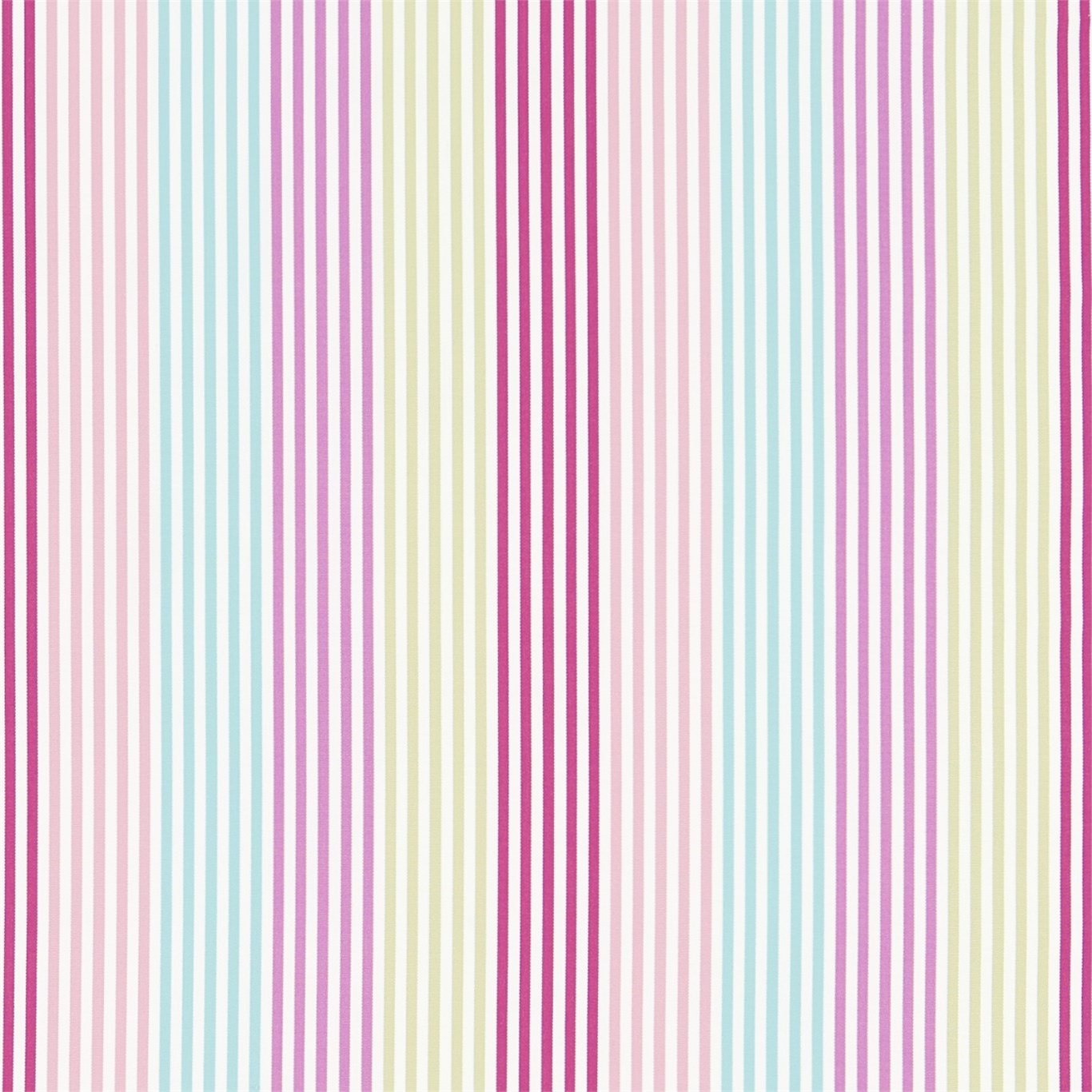 Coordinan con la tela principal unas rayas de muchos colores, con ellas están hechos los cojines, puf y detalles como la guirnalda del cabezal, la pantalla de la lámpara, el estor que hay debajo de las dobles cortinas,…