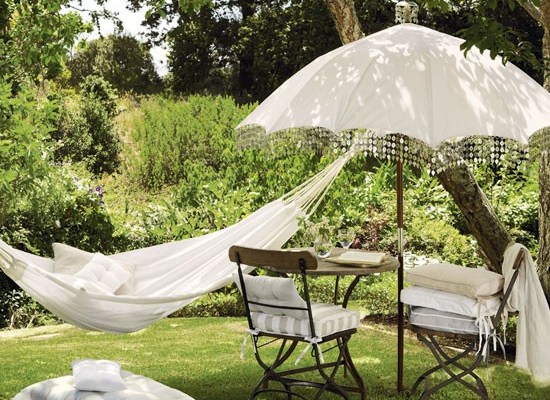 Si no tienes árboles que den sombra a tu lugar de relax, no te olvide de colocar una tela o sombrilla, para protegerte del sol.