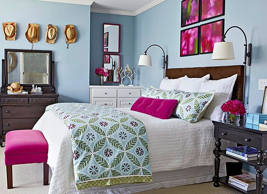 El color azul es un color ideal para decorar el dormitorio y, sobre todo, fácil de combinar con otros colores, como esta preciosa habitación con detalles en fucsia.
