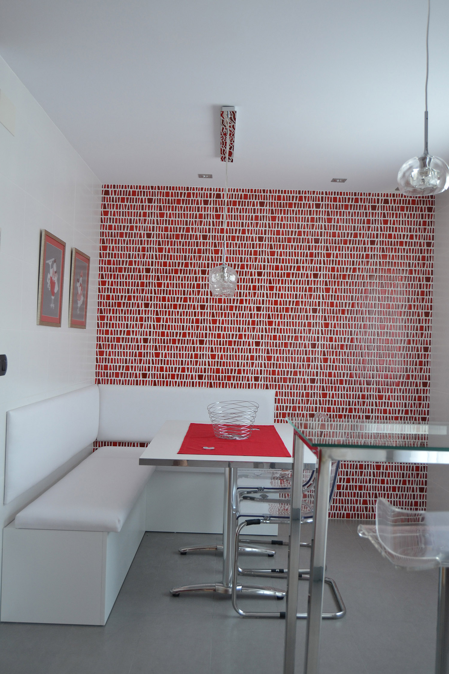 El office de la cocina intentamos aprovechar todo el espacio posible, con un práctico banco con arcón hecho a medida, y también hecho a medida la mesa alta para un tentempié rápido.