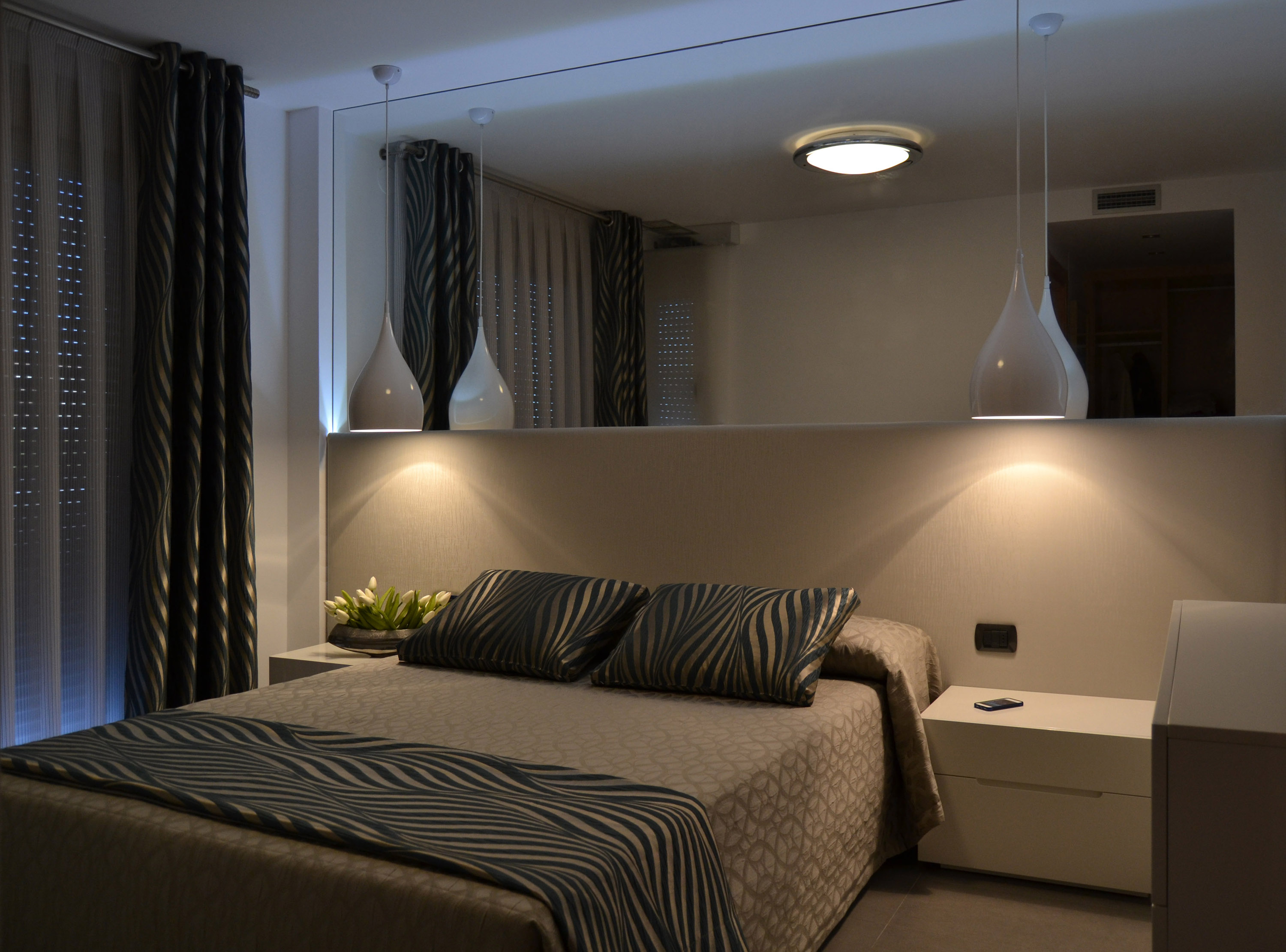El dormitorio principal optamos por panelar con espejo la pared del cabezal para darle más amplitud y luz a la habitación. Colocamos de pared a pared un cabezal hecho a medida de piel ecológica en blanco y el punto de originalidad se lo llevan las lámparas de policarbonato colgadas del techo. Las cortinas, colcha y cojines coordinados en gris, plata y azul.