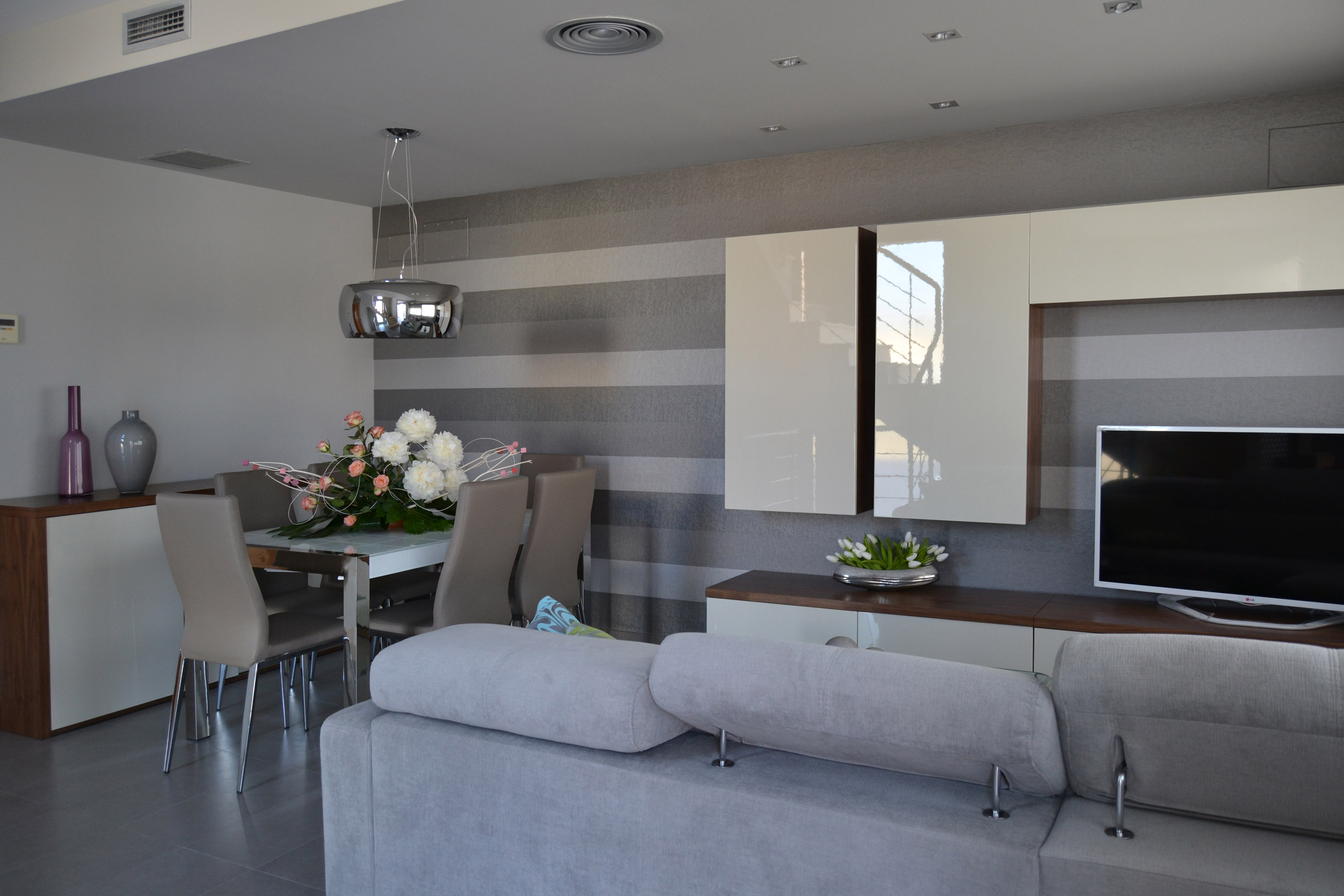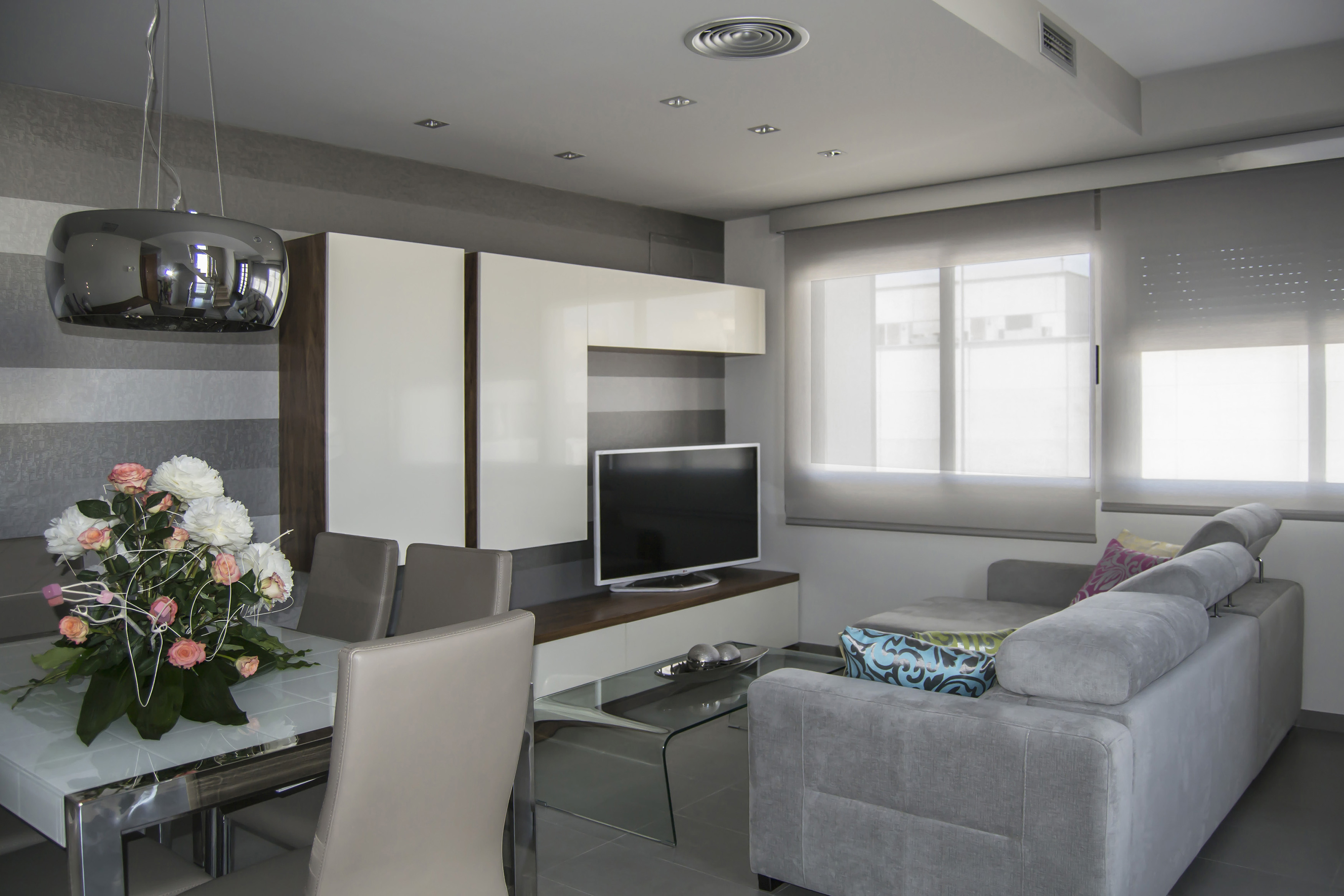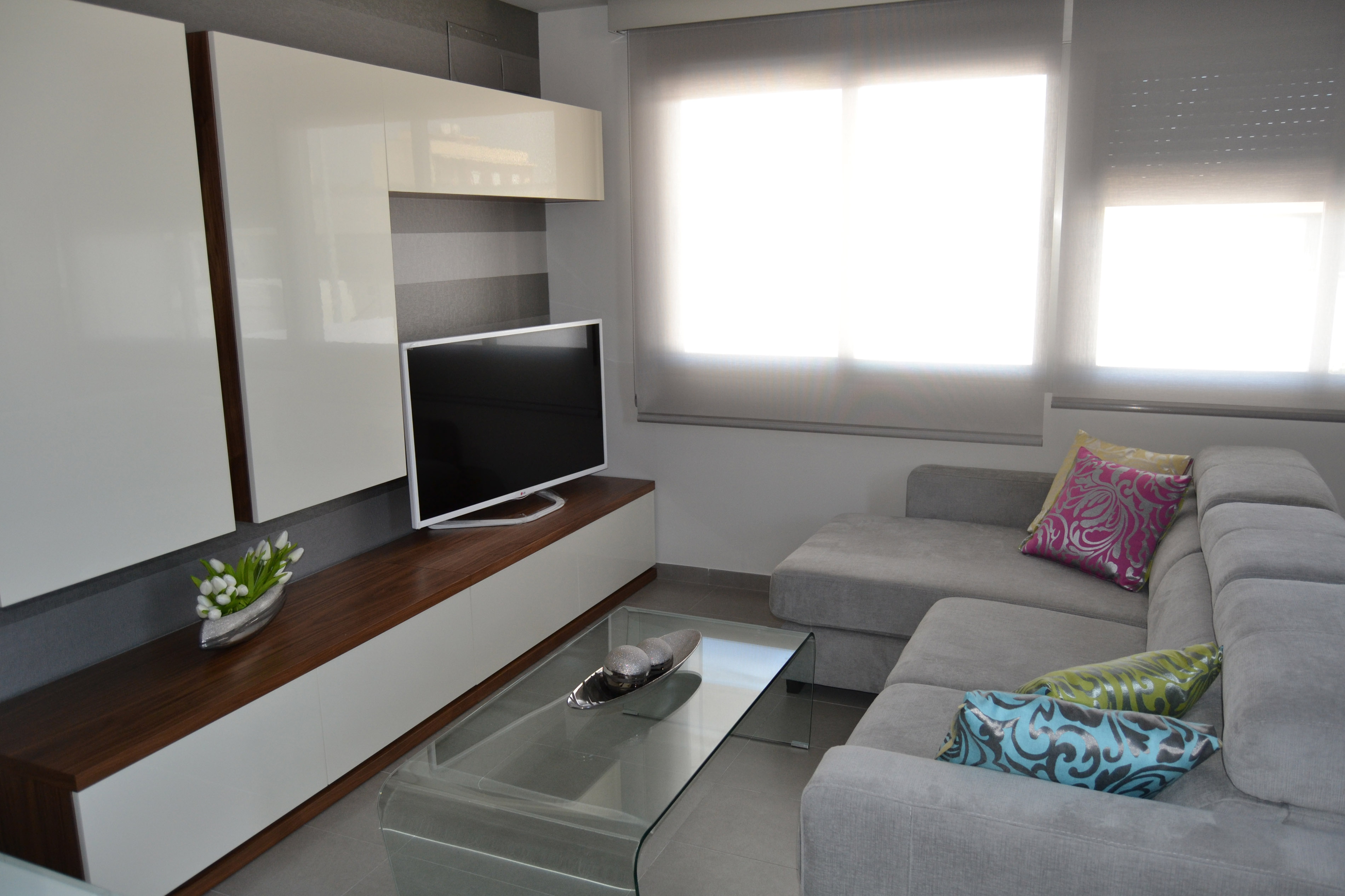 El salón como no era demasiado grande, optamos por unos muebles lacados en blanco con toques de madera, que hacen que quede un salón muy acogedor. El resto de la decoración la puedes ver por ti mism@, tonos neutros con el punto de color en los cojines, ya que no queríamos sobrecargarlo.