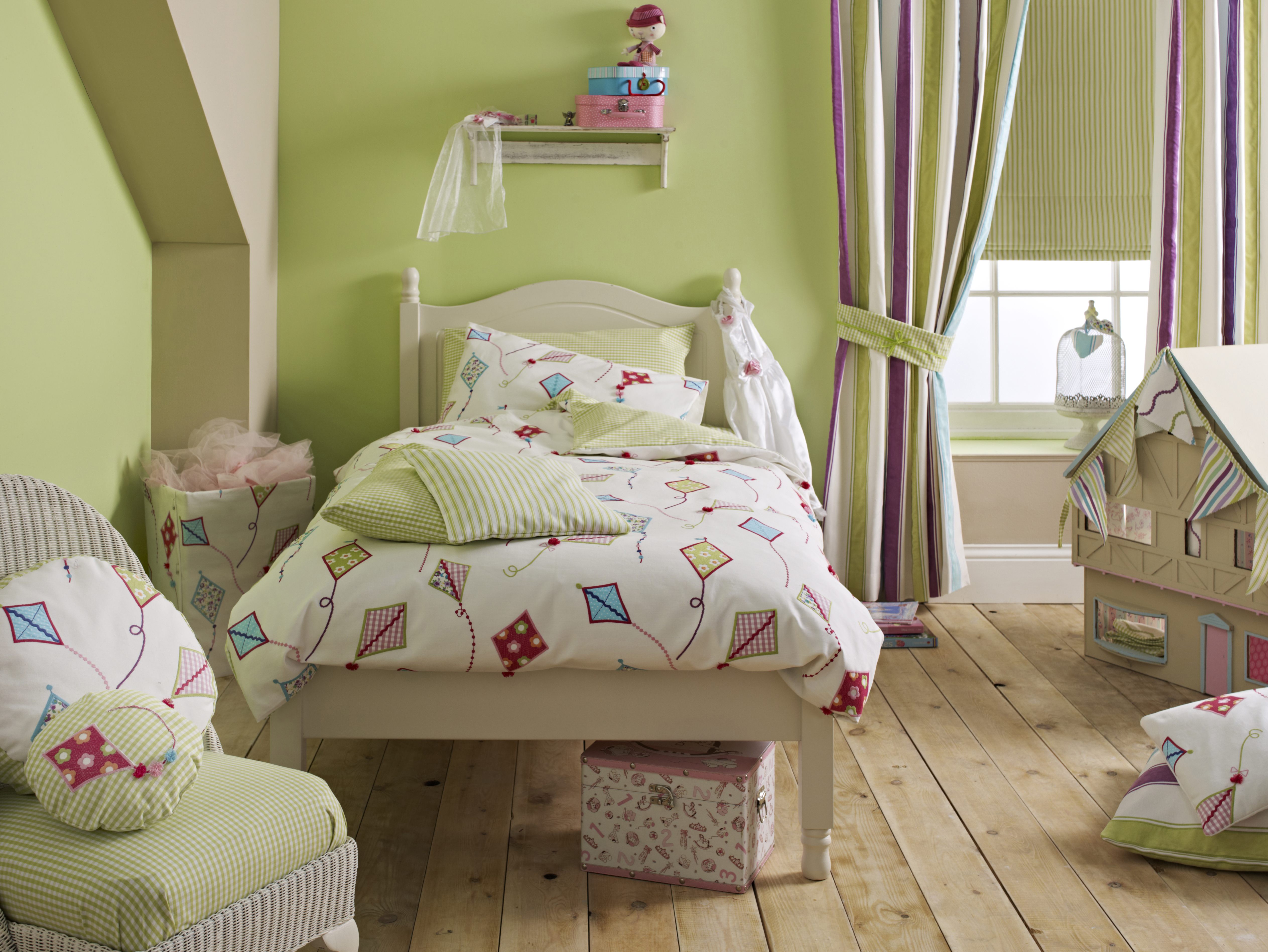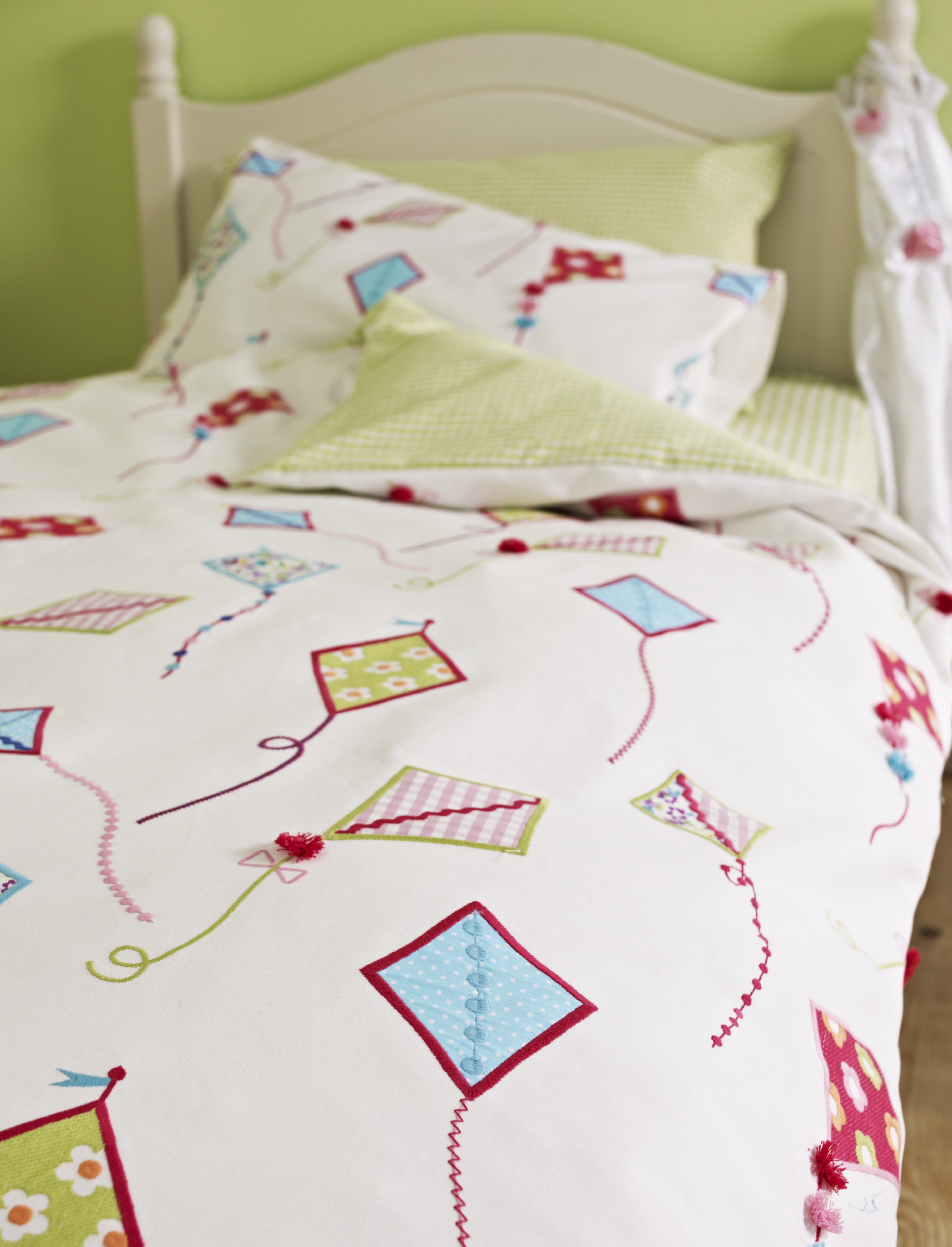Esta funda nórdica con cometas aplicadas y sus colas con pompones es para los dormitorios más divertidos.