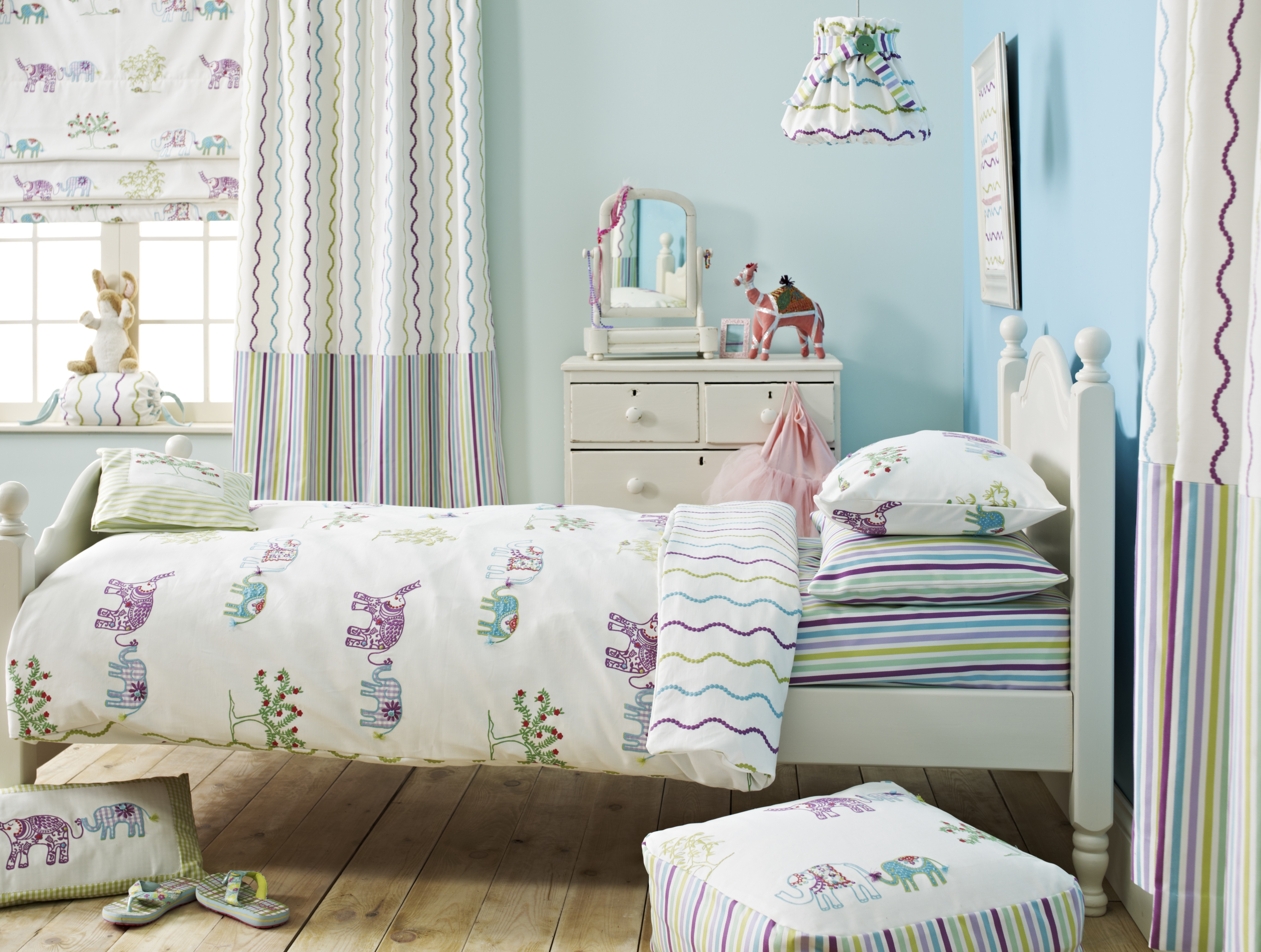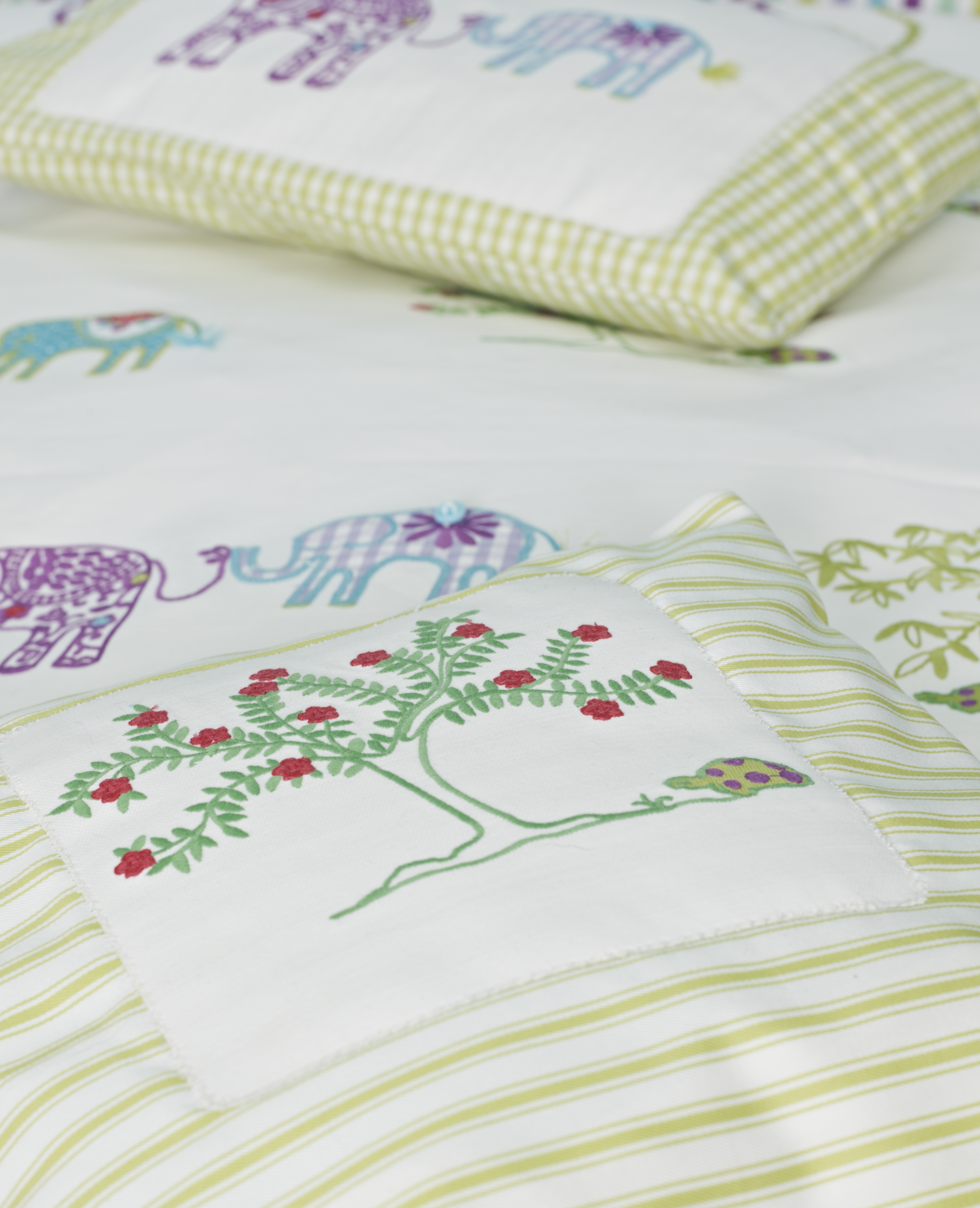 ¡Y qué me dices de los elefantitos! Mira esta funda nórdica con los elefantitos, no podría ser más graciosa, también la tela que coordina, la de las ondas, es bordada. Por la combinación de colores verde, lila y azul, es ideal para decorar habitaciones tanto para niños como para niñas.