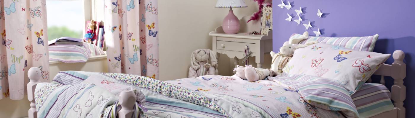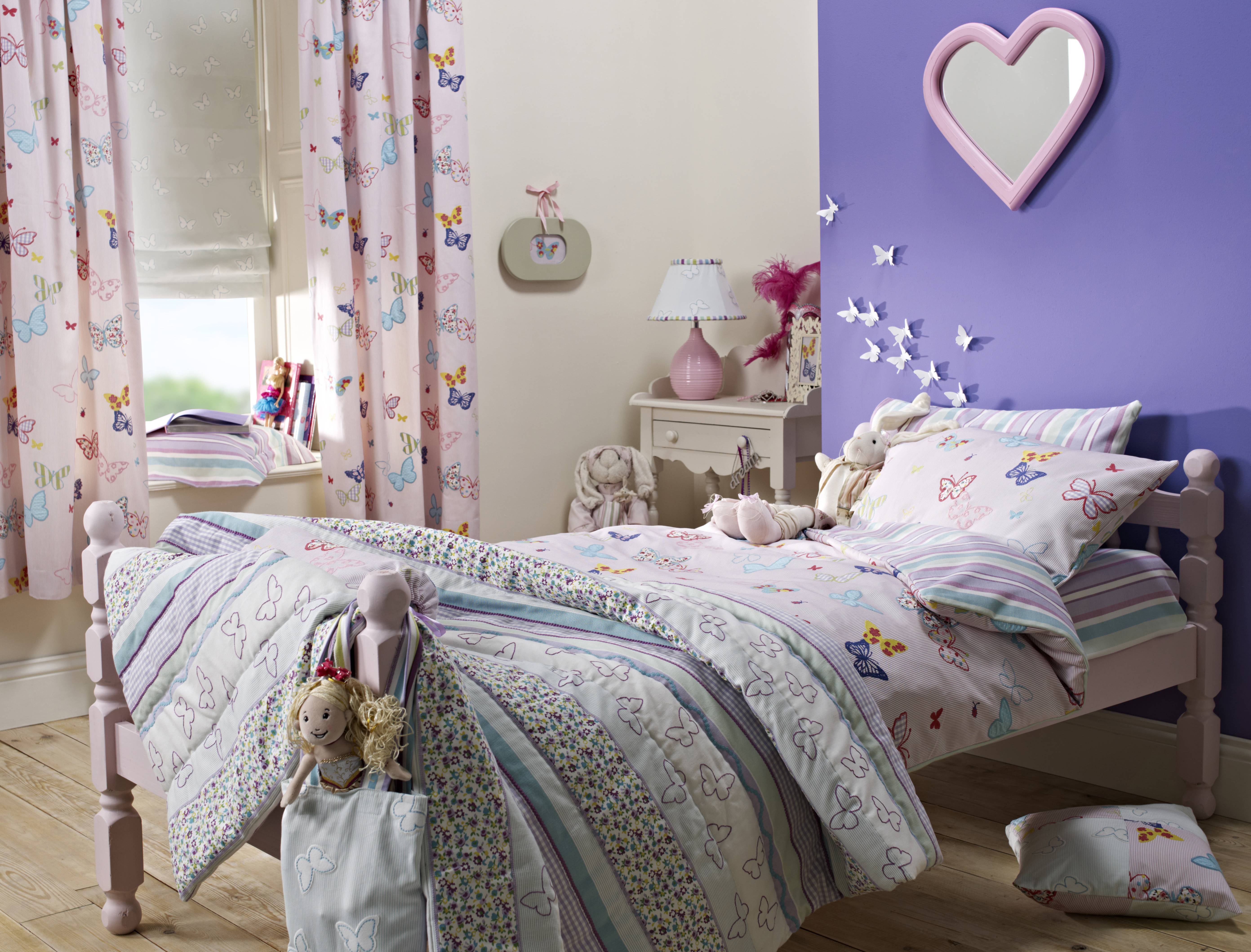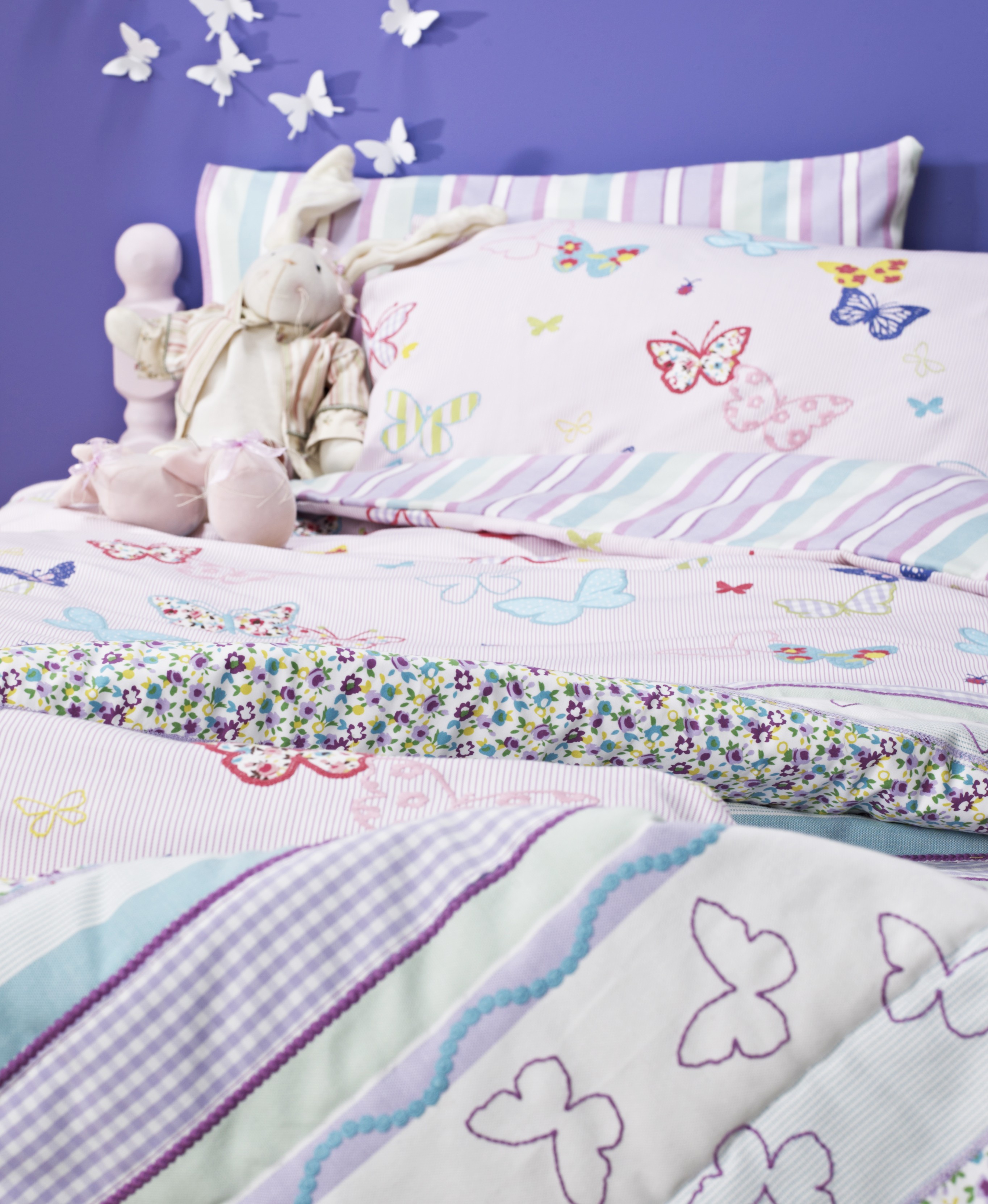 Estas delicadas mariposas bordadas que visten la cama, harán volar la imaginación de la princesa que duerma en ella.