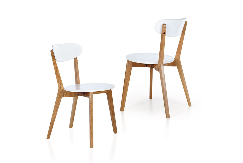 Muebles sencillos de líneas rectas, donde predomina el color blanco para dar luz a la casa y la madera para dar calidez, como esta original mesa de centro con solo tres patas, o estas sencillas sillas.