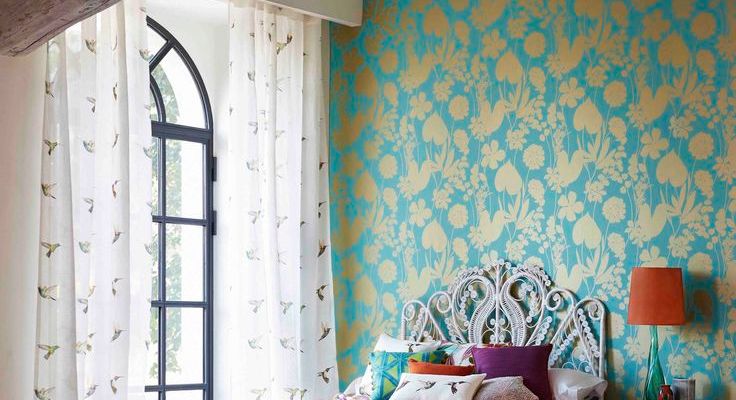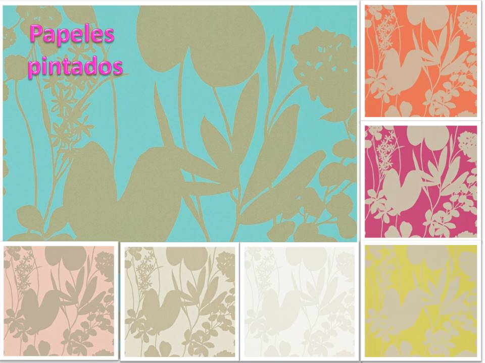 El papel pintado en color turquesa con la silueta de motivos botánicos y con reflejos brillantes, está también en otros colores, aquí en esta imagen te los muestro.