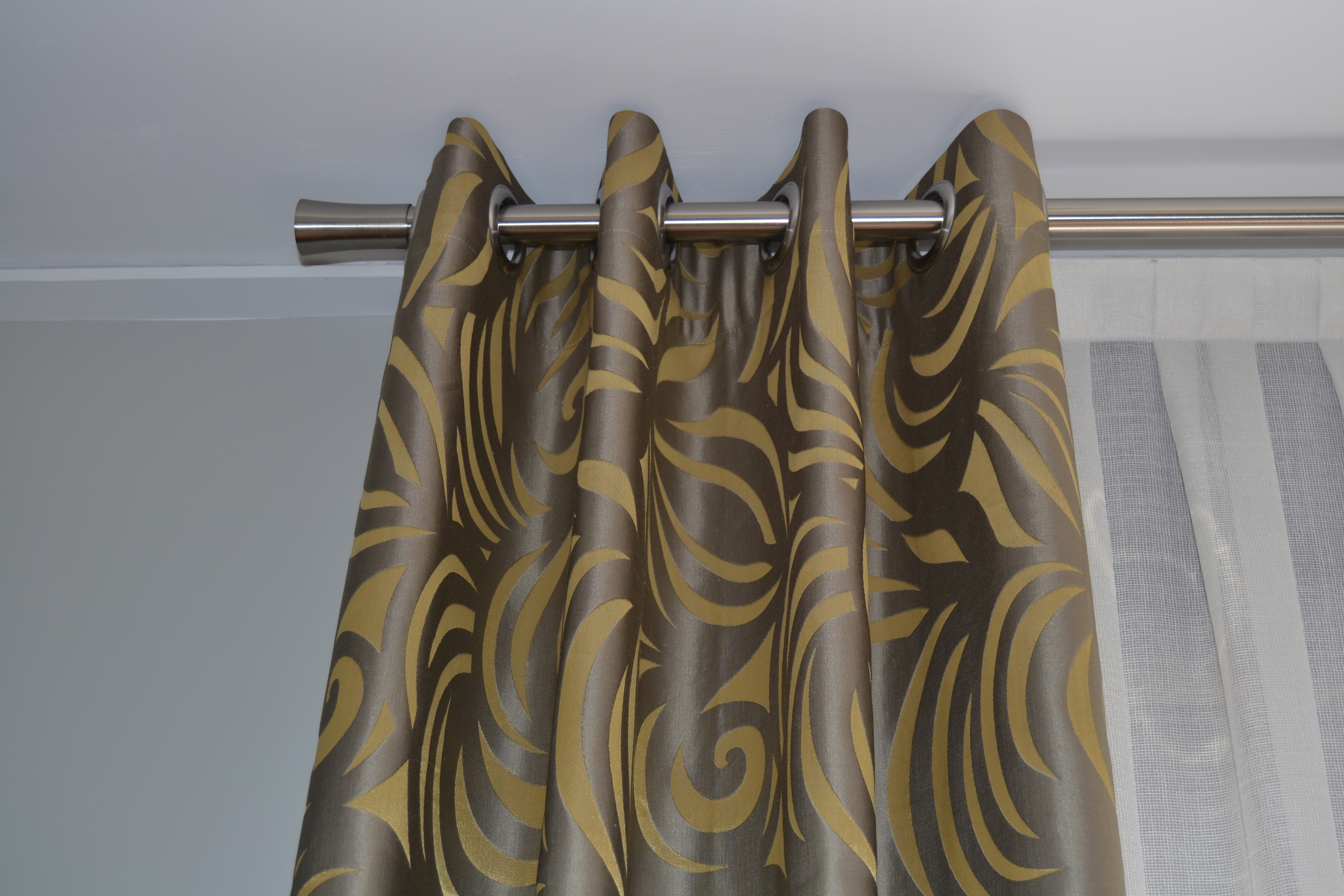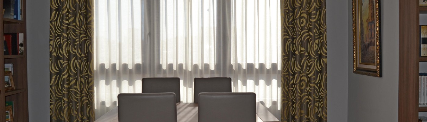 El tejido elegido para el sofá es una suave y agradable tela muy confortable, resistente y lavable. El color escogido el gris, es moderno y actual. Le dimos un toque de color en amarillo con unos cojines de tela adamascada con brillo, con un dibujo elegante y original, igual que las dobles cortinas.