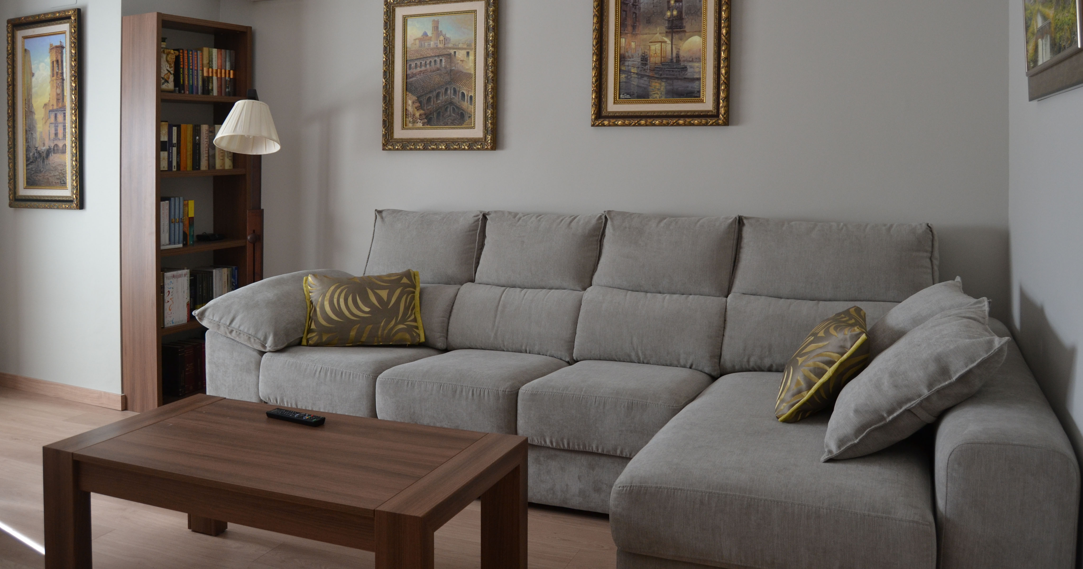 El sofá con chaise longue es la pieza principal del salón, es deslizante con el respaldo alto, y según palabras de su dueña ¡es muy cómodo, el mejor acierto!