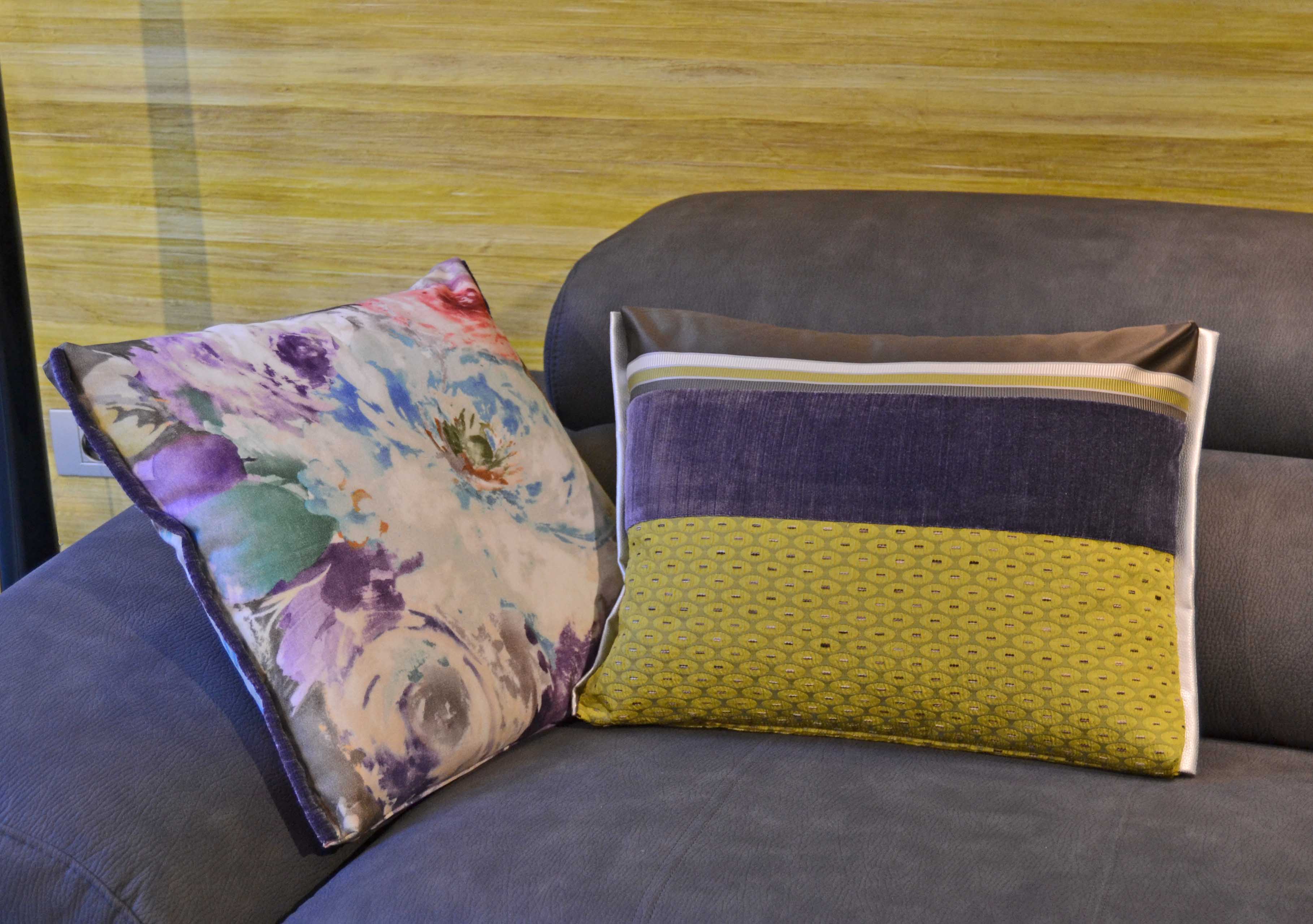 Un detalle que no puede faltar en un sofá son varios cojines y aparte de los estampados como las cortinas, hay 2 de muy originales diseñados por Toni, con distintas texturas y telas acorde con todos los colores del ambiente.