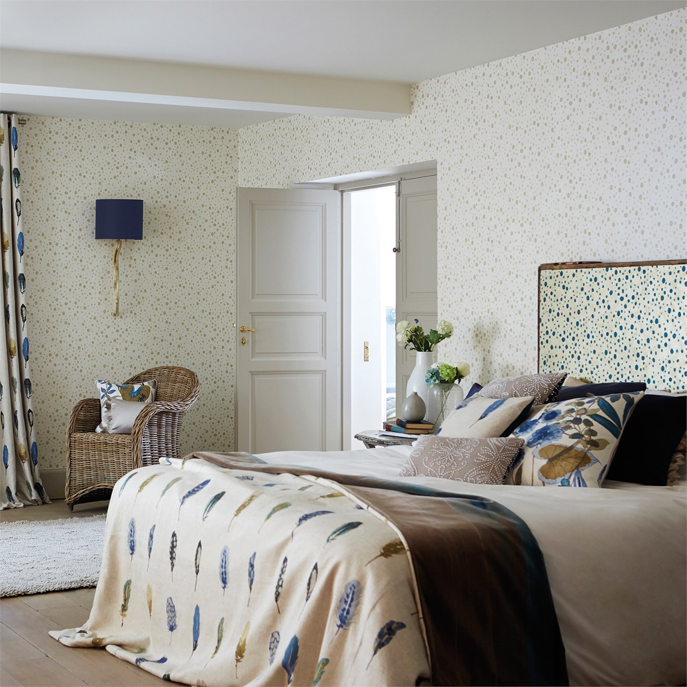 El papel pintado esta como manchado de tinta y puede parecer como manchas de animal. Las cortinas y la colcha tienen un estampado que está de moda, es un precioso y original estampado de plumas en varios colores, los cojines se han mezclado con distintas telas, una estampada de flores y otra bordada.