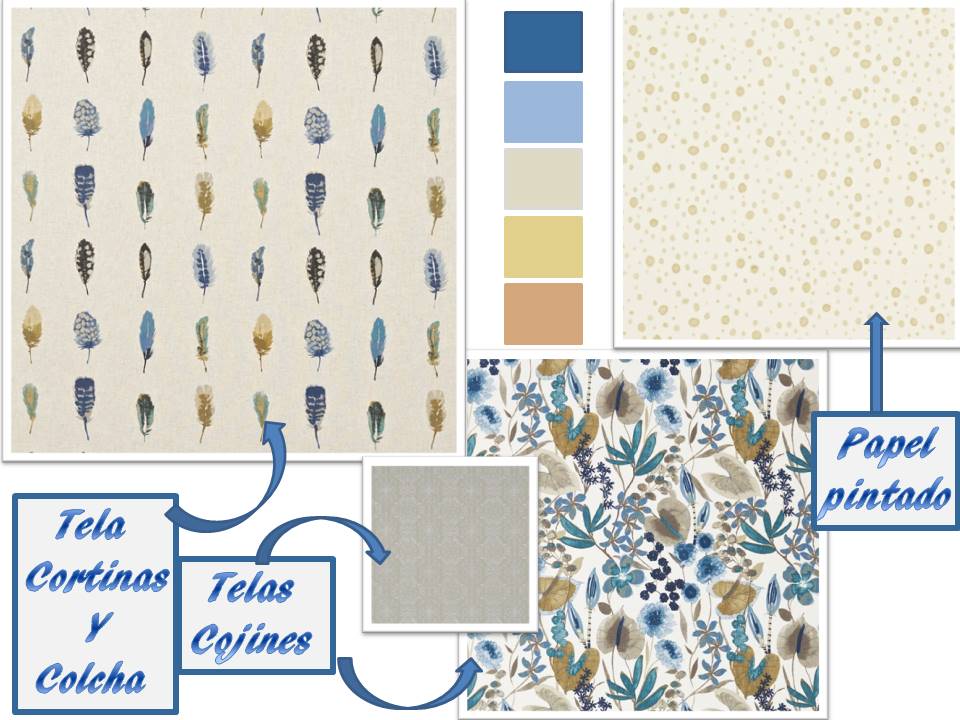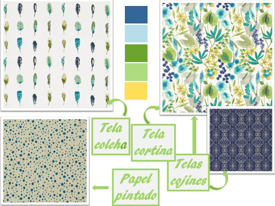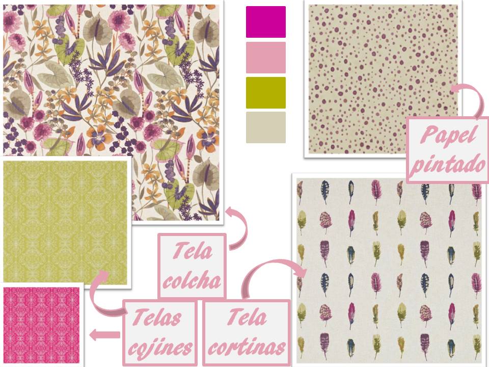 En este caso la preciosa tela de pluma solo la utilizaríamos para las cortinas, la colcha con la colorida tela de flores tropicales, y para los cojines las telas bordadas en color fucsia y verde, en cuanto al papel pintado en manchas en color rosa.