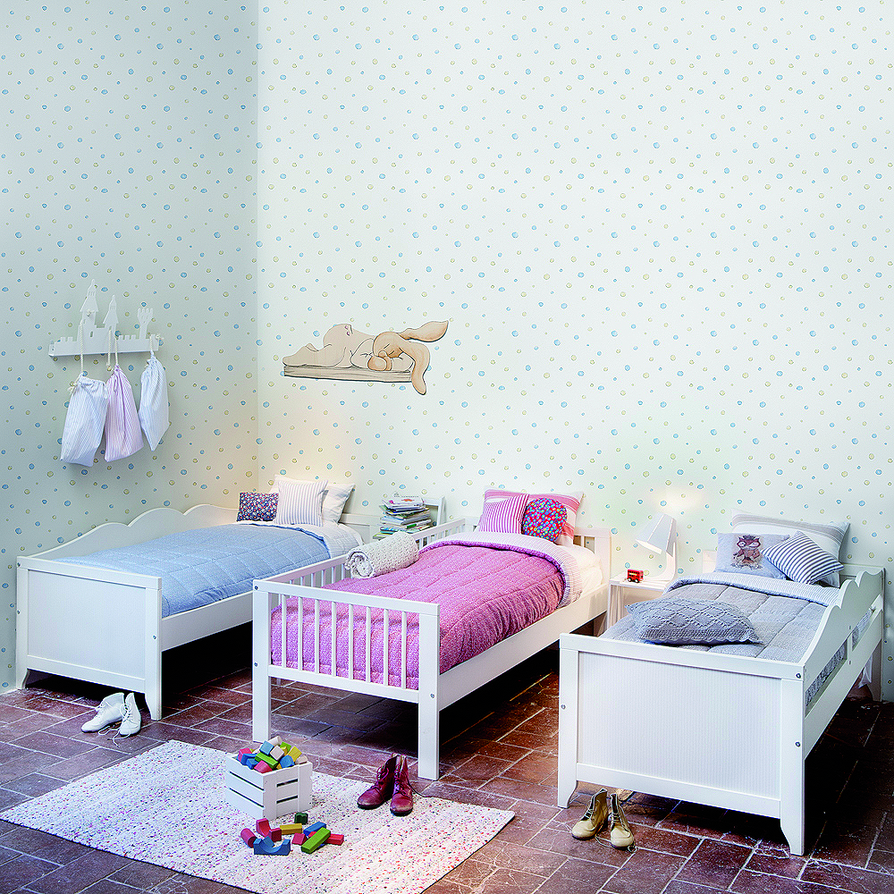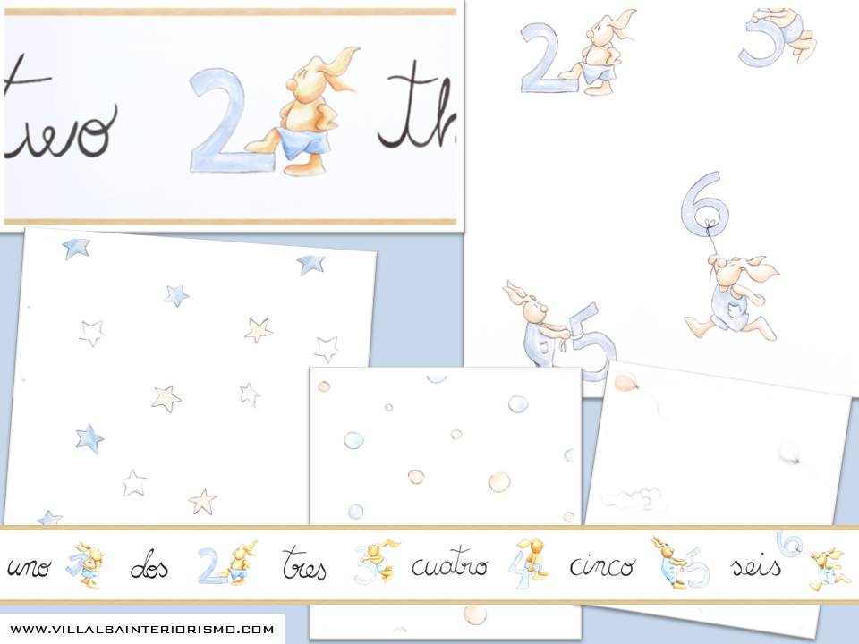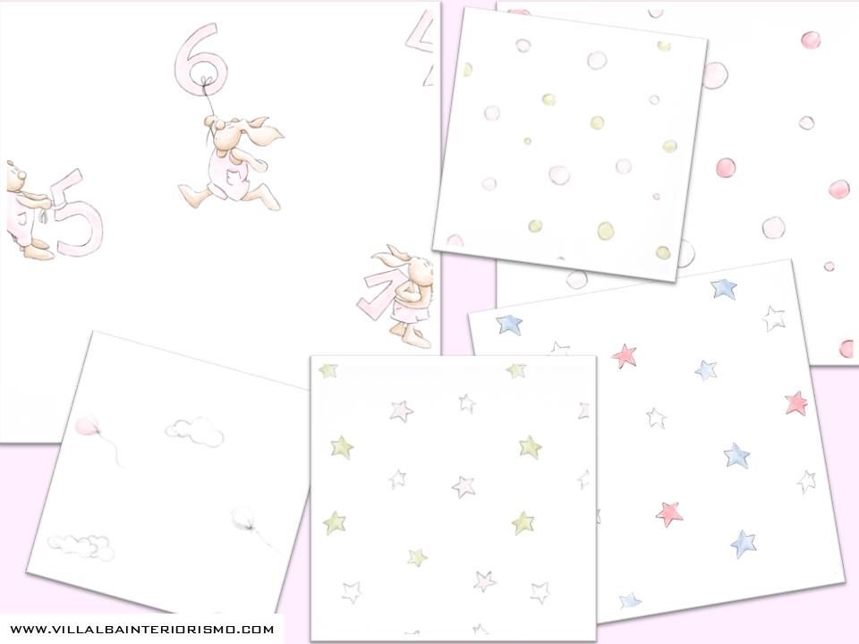 En los papeles pintados los protagonistas son las estrellas, las pompas de jabón, los globos, números y conejos, motivos que seguro les encanta a los más pequeños de la casa.