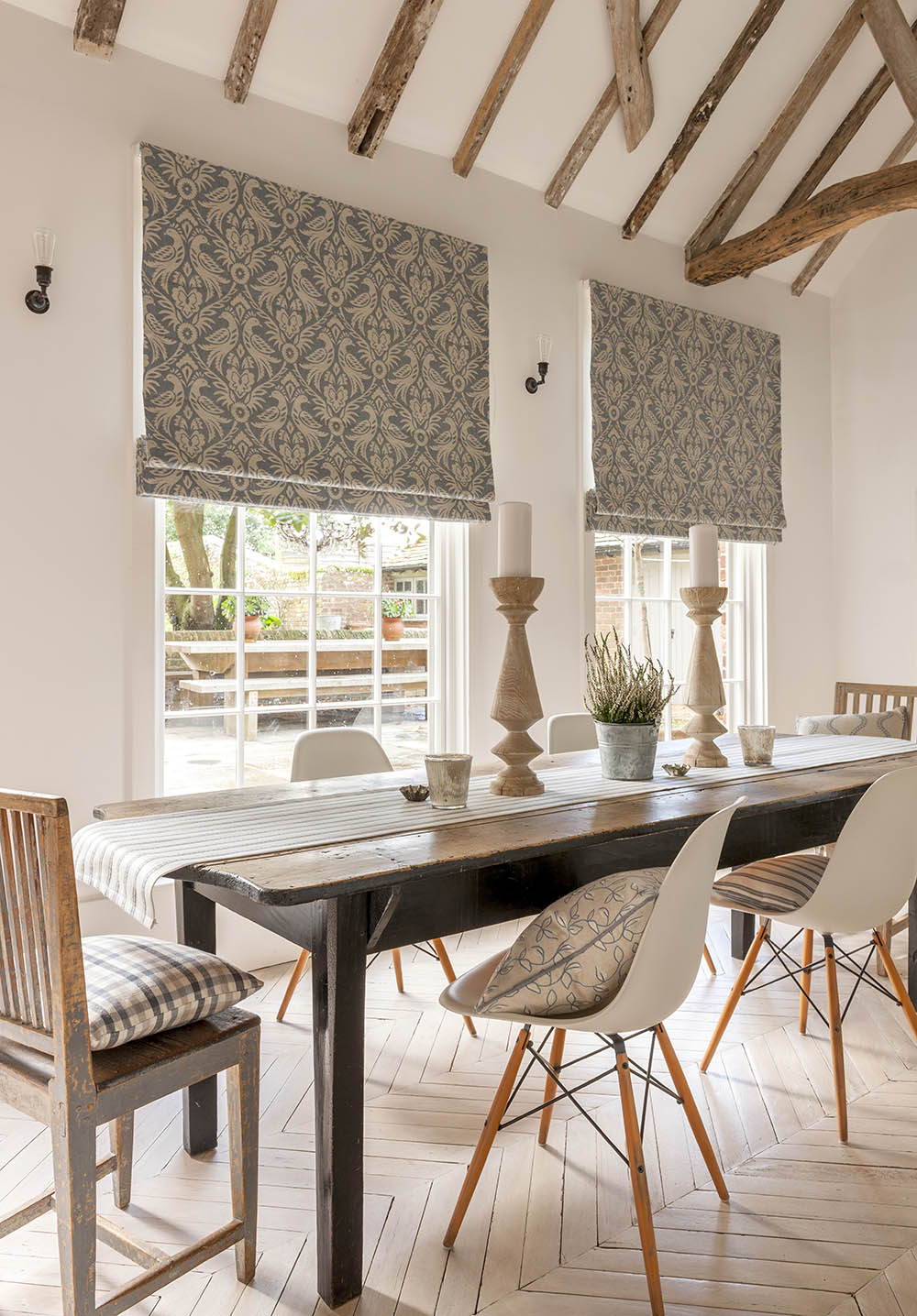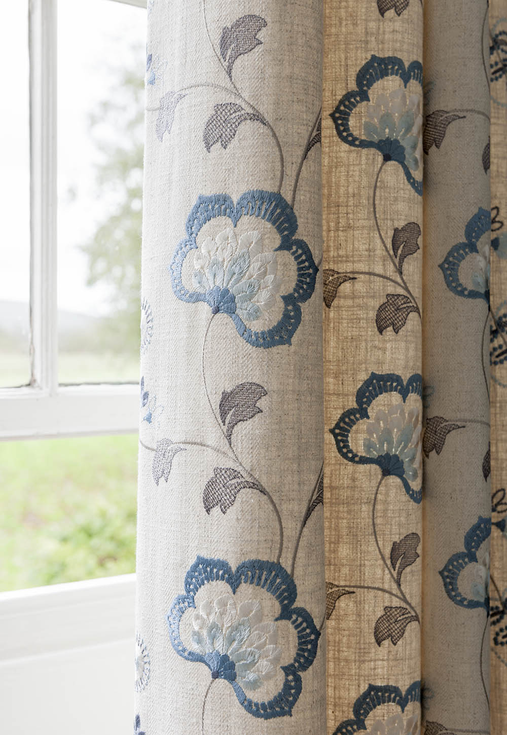 Estas telas tienen un aspecto natural, son de algodón con mezcla de lino, que junto con la combinación del color azul con el marfil, y los delicados bordados de flores, guirnaldas, hojas,… Son perfectas para dar a tus ambientes un aire nórdico y actual.