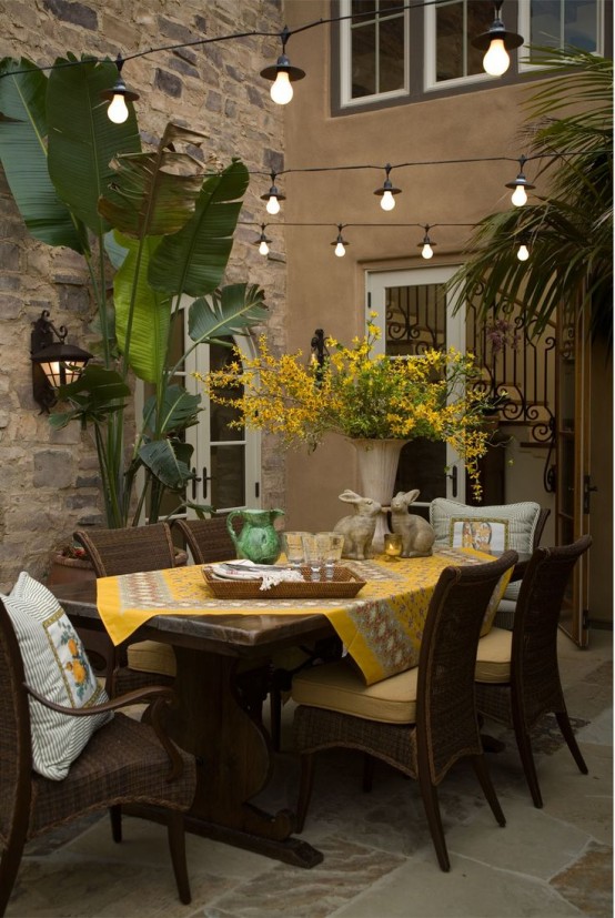 No olvides alrededor de la mesa, crea un ambiente especial con guirnaldas de luces, cojines, plantas,… Ten en cuenta que si a tus textiles le da el sol directo se estropearán rápidamente, así que usa textiles outdoor, son tejidos con tratamientos especiales para el exterior, ya te he hablado de ellos en varias ocasiones, como en la entrada «Para el exterior, textiles outdoor«.