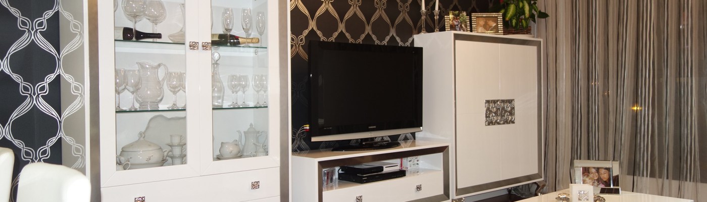 Sonia contactó por teléfono con nosotros a primeros de Agosto para preguntarnos por un salón que había visto en el blog y le gustaba mucho, me envió por whatsapp una foto de su salón y las medidas. Tenía el papel pintado en negro y unos dibujos en plata, el sofá blanco, la mesa y las sillas de estilo moderno. Después de ver algún que otro mueble más minimalista para el salón, pronto lo tuvo decidido y lo hizo por esta espectacular composición de vitrina, mueble TV, mueble contenedor y mesa de centro, todo lacado en blanco con las molduras, patas y tallas en plata. ¡¡Sonia tiene muy buen gusto!!