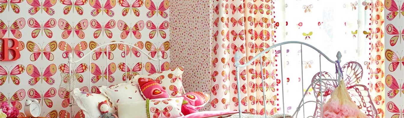 Las mariposas y en rosa son uno de los motivos que más les gusta a las niñas. Con estas telas y papeles pintados se pueden hacer multitud de combinaciones, desde colocar solo el visillo bordado sin las dobles cortinas, el papel pintado solo el de las manchas y la colcha blanca con solo una cenefa de la tela de las mariposas, por ejemplo. Otra combinación el papel pintado de mariposas, el visillo en la ventana liso, la doble cortinas de mariposas, y la funda nórdica o colcha lisa rosa y cojines de mariposas. Bueno un montón de coordinados y combinaciones que seguro les encantan a las niñas de casa.