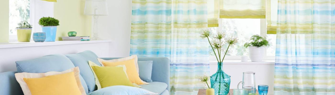 También las cortinas muchas veces marcan el estilo del ambiente, como en este salón que son las protagonistas. Estas cortinas son unos visillos a rayas horizontales de colores en azules y verdes que definen un ambiente juvenil, alegre y divertido. Es un visillo fino que deja pasar la luz natural, se puede lavar en la lavadora y esta en otros preciosos colores como los colores naranjas o los rosas, naranjas y verdes.