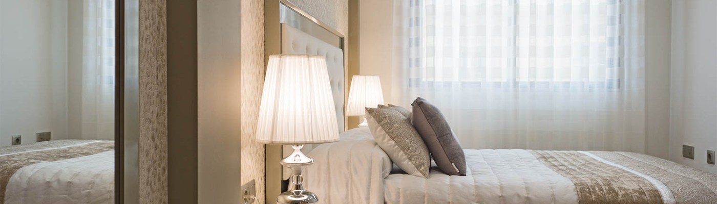 El dormitorio con la decoración en tonos suaves: blancos, crudos, beige,… invita al descanso y a relajarse. En la pared un precioso papel pintado de Roberto Cavalli con un discreto y elegante dibujo de animal print y reflejos brillantes. La cortina a rayas horizontales colocada con una barra de acero le da profundidad al dormitorio.
