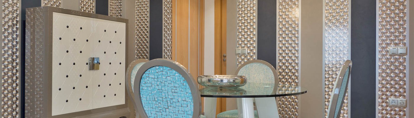 La zona de día esta distribuida en dos espacios bien diferenciados, en la zona del comedor colocamos un papel pintado muy original, a rayas en dos colores y en un dibujo en 3 D, colores que le quedan perfectos con los muebles. La preciosa tapicería de terciopelo en tono azul le daba al ambiente un toque fresco. También la lámpara del techo con cristales queda perfecta encima de la mesa redonda.