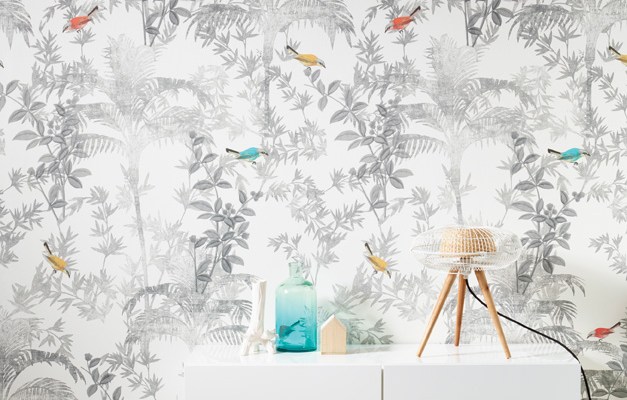 ¿Cómo te van las vacaciones? ¿Ya las has hecho?… ¡¡Vaya, este año no puedes hacerlas!! ¿Te apetecería estar en un lugar tranquilo y que te inspire descanso? Pues los papeles pintados que te enseño puede que te transporten al corazón de la selva tropical, a un suntuoso paraíso de palmas con algunas flores y aves exóticas preciosas.