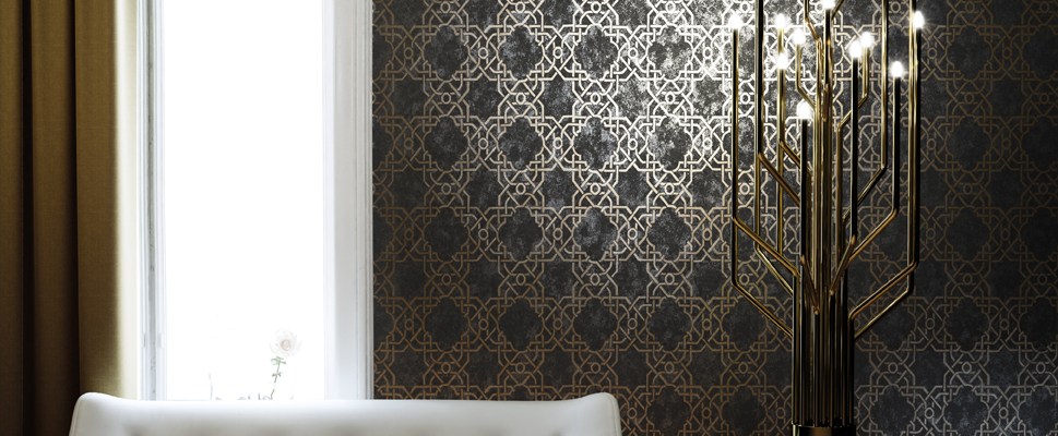 Son papeles pintados con preciosos motivos geométricos muy representativos en las decoraciones árabes como estrellas, cuadrados, círculos,… pero son sofisticados y glamurosos por la incorporación de los brillos dorados o plateados, como éste negro y dorado. ¡¡No habrá una mezcla más atractiva!!