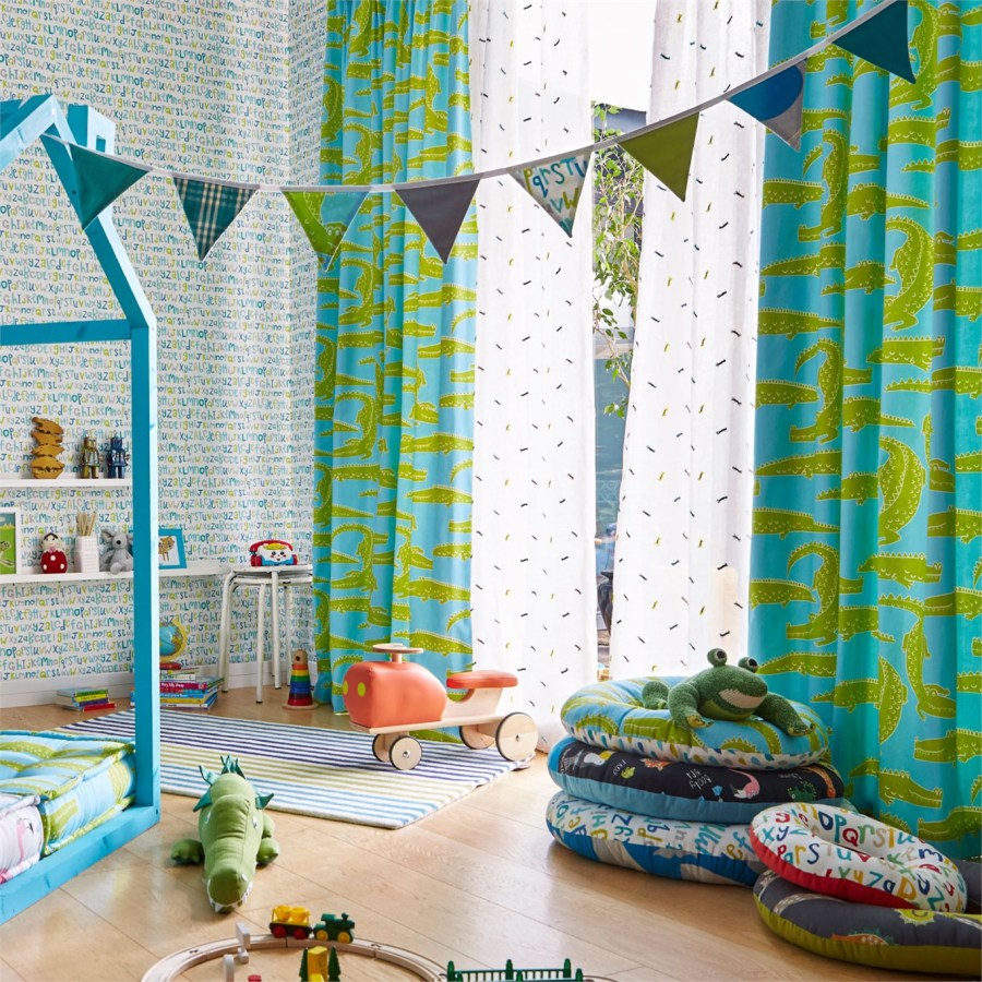 En el dormitorio de los niños, también queda muy bonita esta cortina con motivos de cocodrilos en verde.