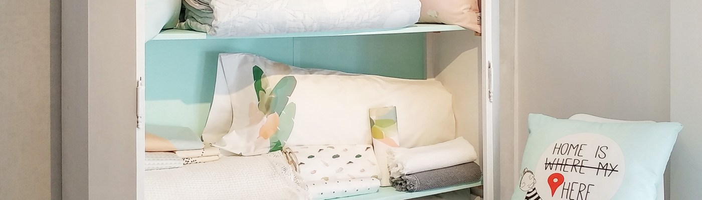 En el escaparate, aparte de los cojines, también he colocado una colcha tipo bouti de Bassols, con un estampado discreto con hojas exóticas y el color de moda, el verde mint, con ella el dormitorio queda luminoso y fresquito, perfecto para esta época del año. Para completar el conjunto, una sábana lisa también en verde y de Bassols.
