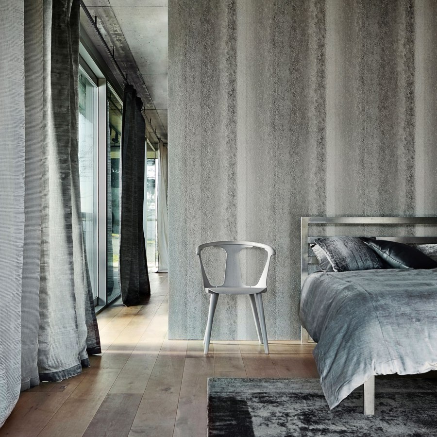 Hay cantidad diferentes de rayas, las mil rayas, más anchas y simétricas, asimétricas, combinando varios colores, difuminadas,… Este papel pintado de rayas hace como un degradé en distintos tonos de gris, y además tiene como unas piedrecitas incrustadas, es muy moderno y original. ¡Me parece precioso!