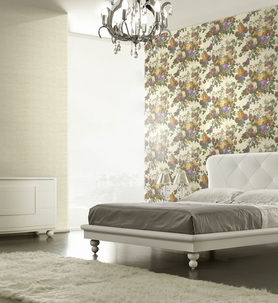 Si eliges un papel pintado con flores más llamativas el resto del dormitorio tienes que decorarlo con tonos más neutros, para que no te quede cargado el ambiente, como estos papeles pintados diseñados por Blumarine.