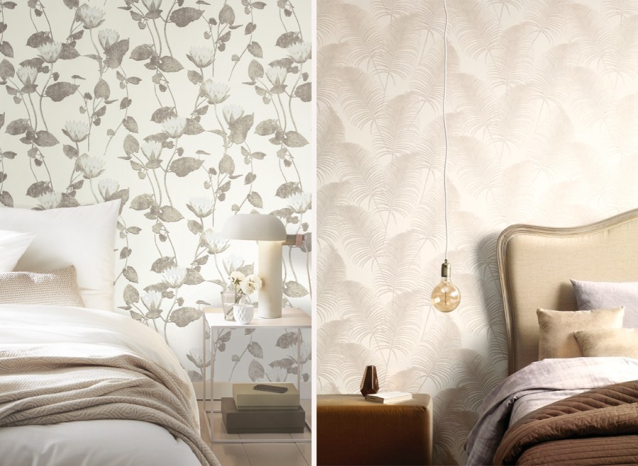 Las flores para ambientes románticos, hay papeles pintados con flores y hojas sencillas con solo unos trazos y en colores discretos, éstos también se pueden combinar fácilmente con la ropa de cama, como estos preciosos y elegantes papeles pintados que con ellos nunca se falla.