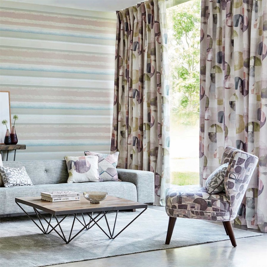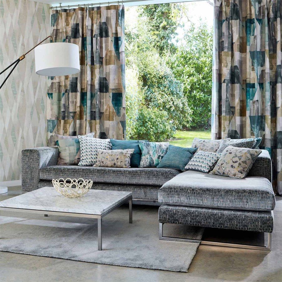 Papeles pintados y telas coordinan a la perfección para formar ambientes tan bonitos, modernos y con mucha personalidad como en estos salones, con las dobles cortinas con estampados geométricos exagerado y que le va perfectamente con el papel pintado, el tapizado del sofá y todos los cojines.