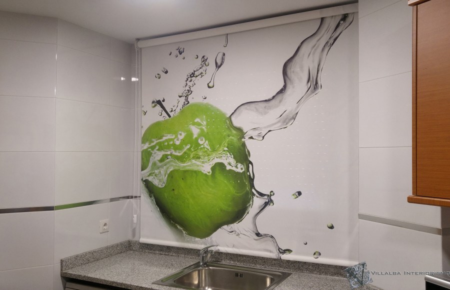 En la ventana de la cocina le colocamos una enrollable con una serigrafía muy fresca, una manzana que dan ganas de… ¡comérsela!