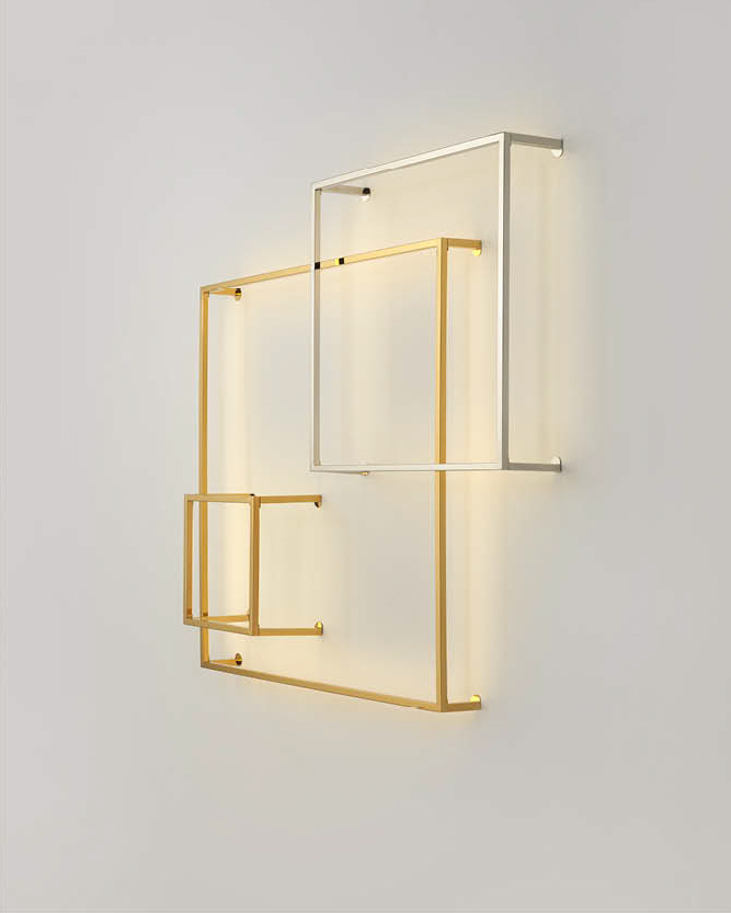 Otro aplique original es éste que está formado por distintos cuadros de metal acabados en oro brillo y cromo, con la posibilidad de poder hacer una composición personalizada.